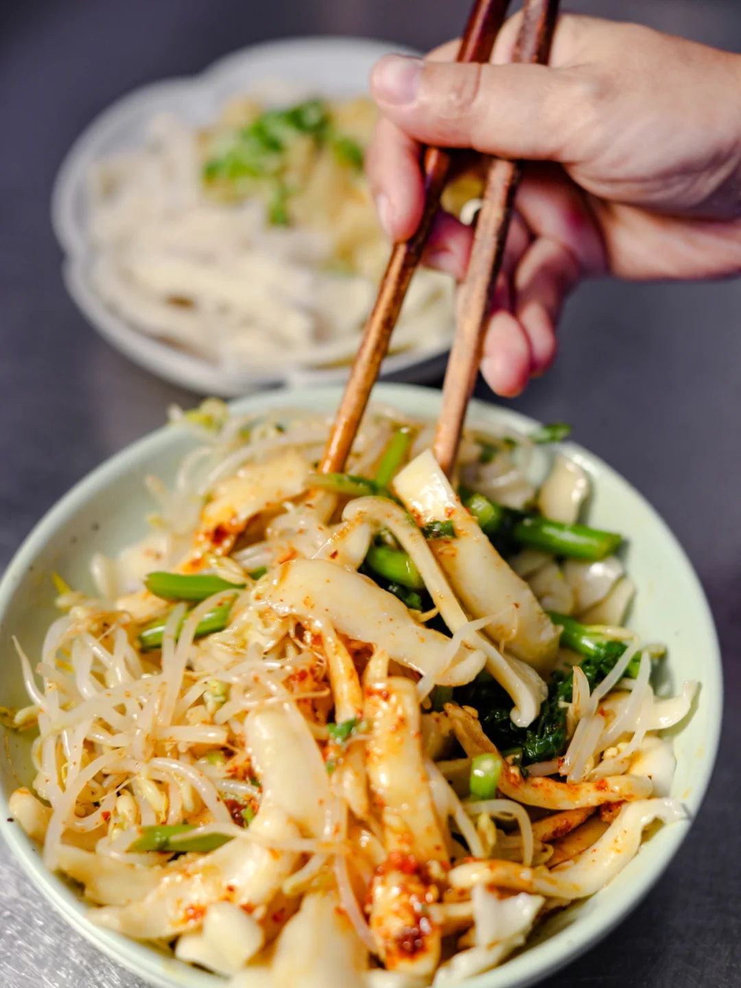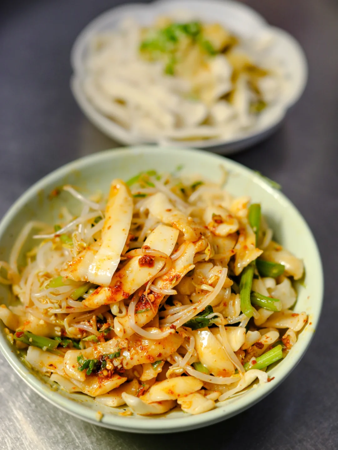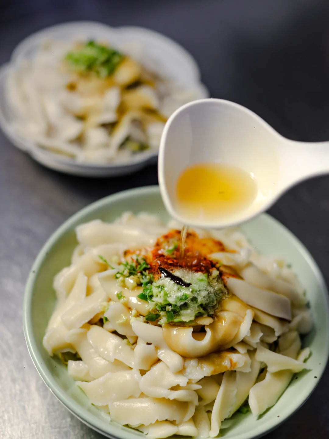 2.盘中放入汆烫好的绿豆芽,刀削面煮好之后,过一下凉水,铺在豆芽上,加入蒜末,葱,可以适当添加一点蒜苗,辣椒面放上少许,加入刚才煮过的调味汤汁,根据需求添加即可,菜籽油烧热浇上,一声刺拉的声音,温暖了厨房。