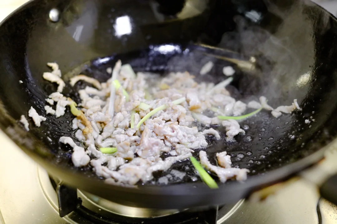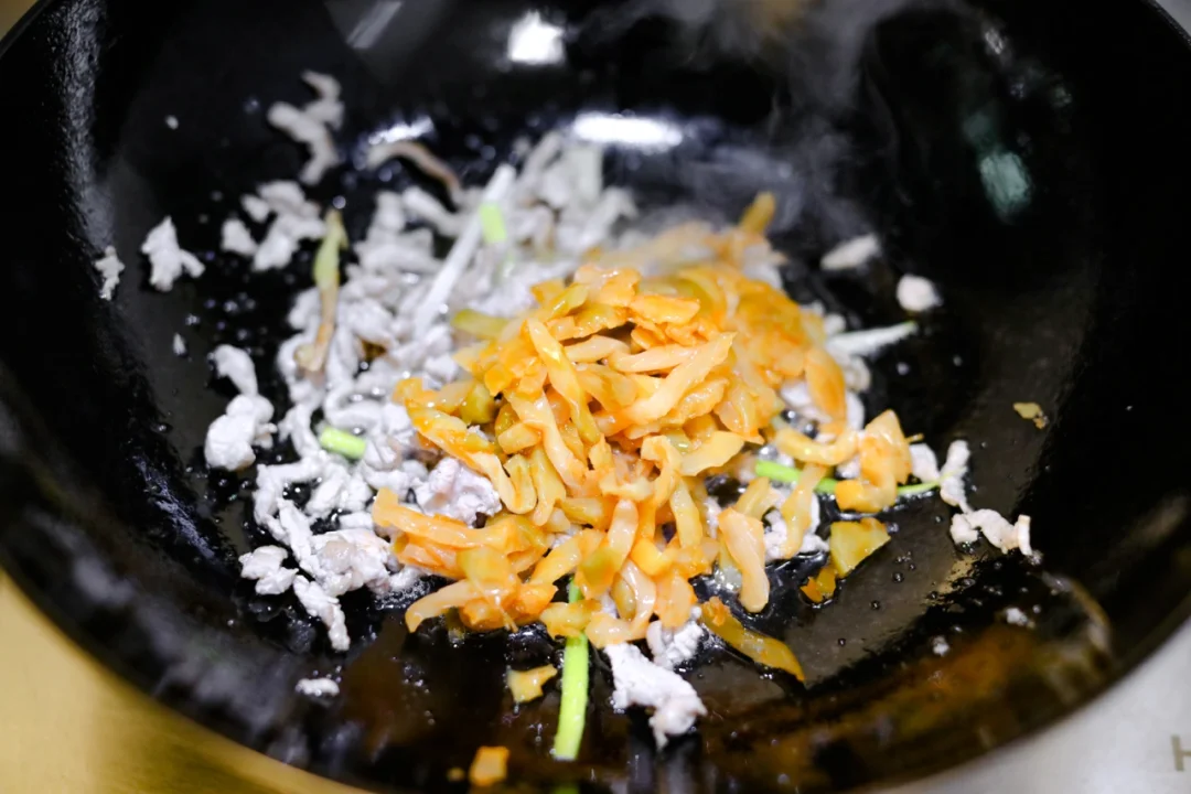 1.锅里放入食用油,加入花椒粒,炸香之后捞出来,把肉丝放进去,翻炒变色之后,加入现成的榨菜丝,放入葱丝和姜丝,让味道充分融合之后,加入少许料酒,生抽增鲜调味。