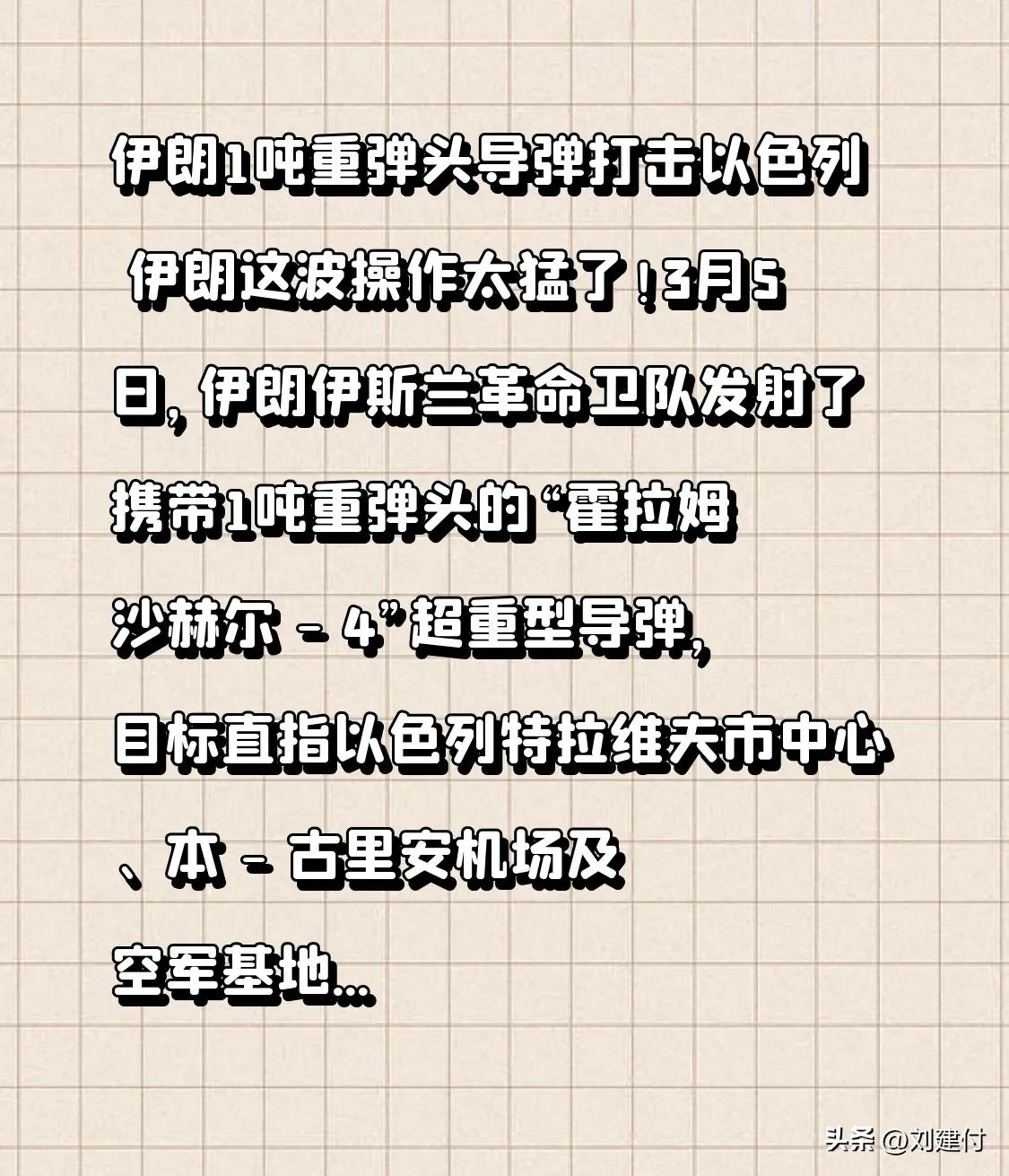 伊朗1吨重弹头导弹打击以色列 伊朗这波操作太猛了!3月5日,伊朗伊斯兰革命卫队发射了携带1吨重弹头的“霍拉姆沙赫尔 - 4”超重型导弹,目标直指以色列特拉维夫市中心、本 - 古里安机场及空军基地。这导弹可不简单,长约13米,直径约1.5米,重约30吨,大气层外速度达16马赫,进入大气层后约8马赫,10 - 12分钟就能击中目标,很多防御系统根本来不及反应。