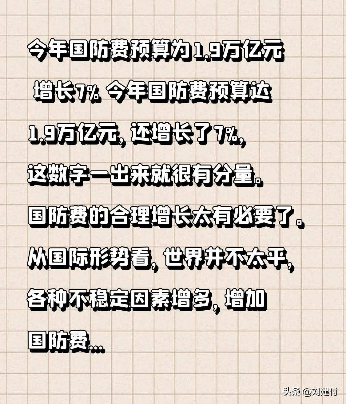 今年国防费预算为1.9万亿元 增长7% 今年国防费预算达1.9万亿元,增长7%,这一数字极具分量。国防费合理增长十分必要。