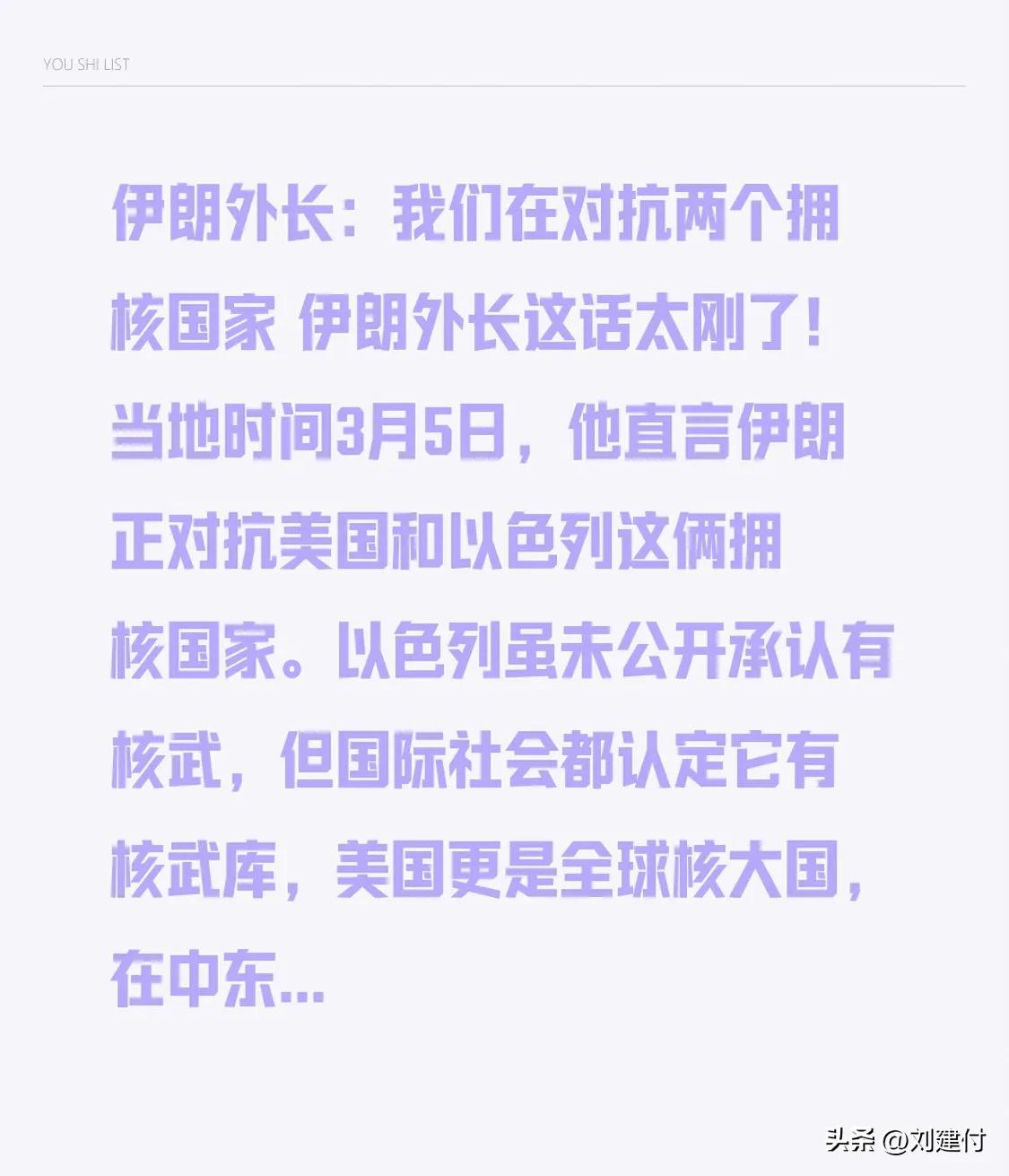 伊朗外长:我们在对抗两个拥核国家 伊朗外长:我们在对抗两个拥核国家。这话尽显强硬!当地时间3月5日,他直言伊朗正与美国和以色列这两个拥核国家对抗。以色列虽未公开承认拥有核武,但国际社会公认其有核武库,美国更是全球核大国,在中东军事存在感极强。