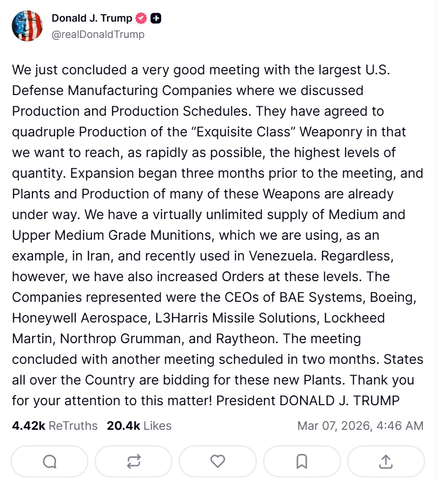特朗普约见美国各大军火商,要求增加产量——特朗普在社交媒体发文表示,