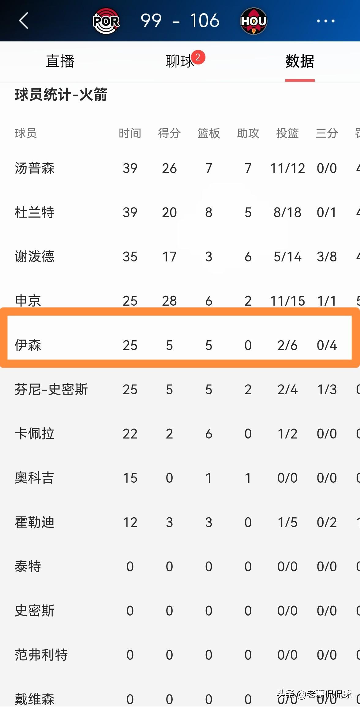 火箭大将伊森真是无可救药了!尽管今天火箭在主场以106:99战胜开拓者,但是伊森的表现却非常的暗淡,他在首发出战的25分钟里,投篮6中2,其中三分球4中0、罚球1中1非常低效的得到5分,还有5次犯规。