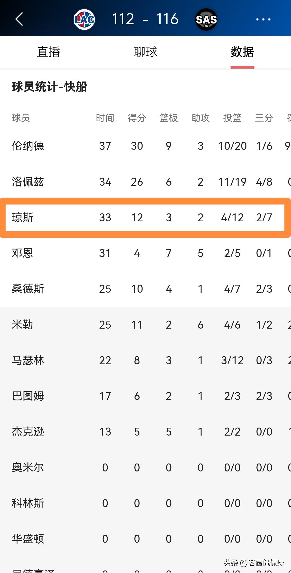 整场比赛下来,小琼斯首发出战33分钟,投篮12中4,其中三分球7中2、罚球2中2非常低效的得到12分。