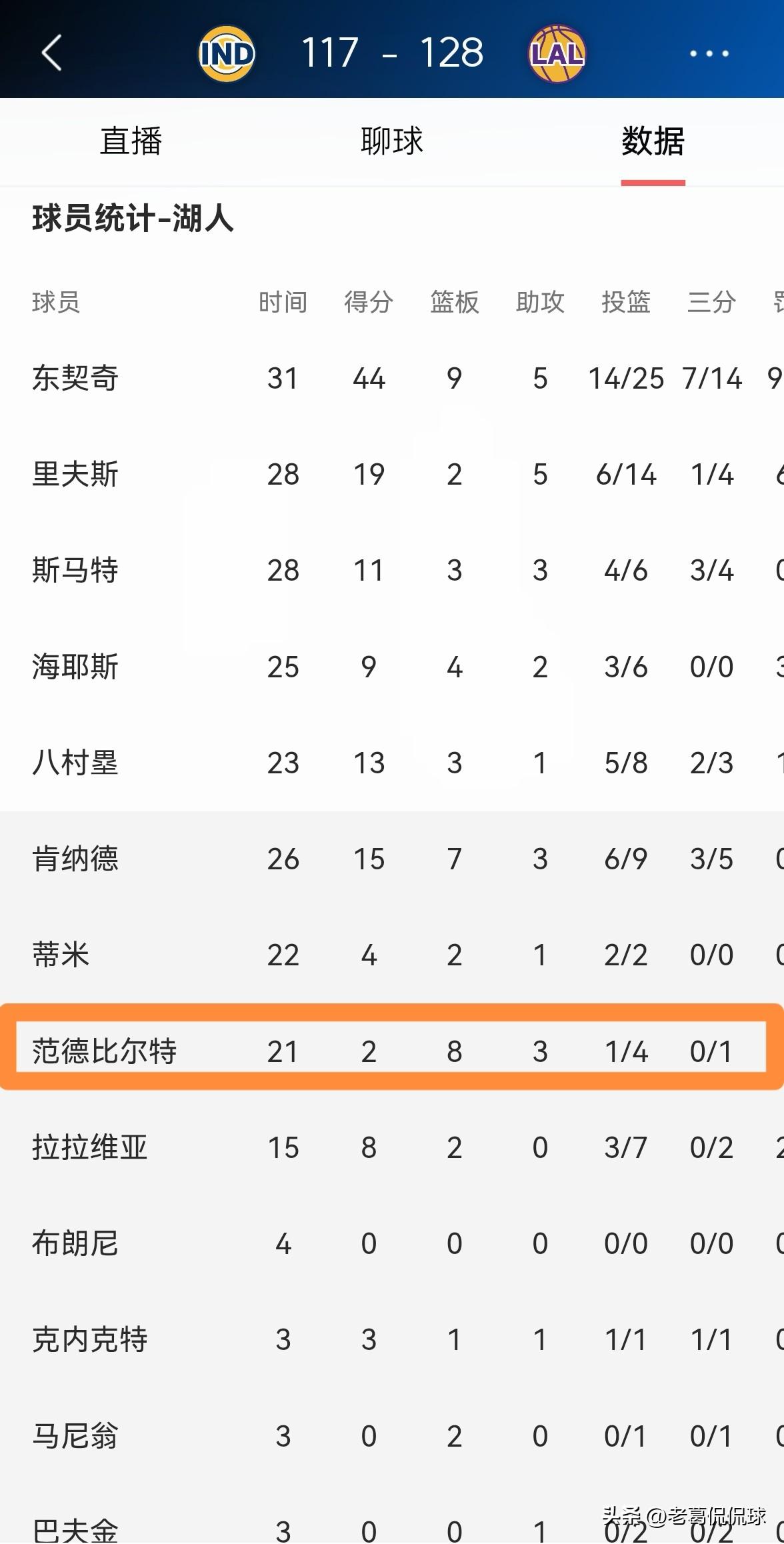 湖人悍将范德比尔特真是充满了能量!在今天湖人主场以128:117战胜步行者的比赛中,范德比尔特在攻防两端都充满了活力,他在替补出战的21分钟里,投篮4中1仅仅得到2分,不过有8篮板3助攻1抢断,他的场上正负值为+12。