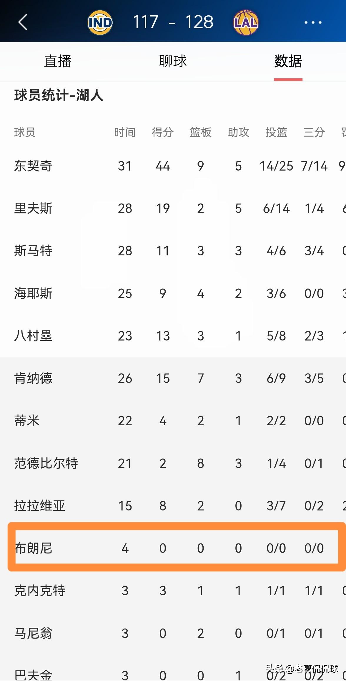 湖人新星布朗尼真是毫无存在感!虽然今天湖人在主场以128:117轻取步行者,但是布朗尼在攻防两端都毫无存在感。