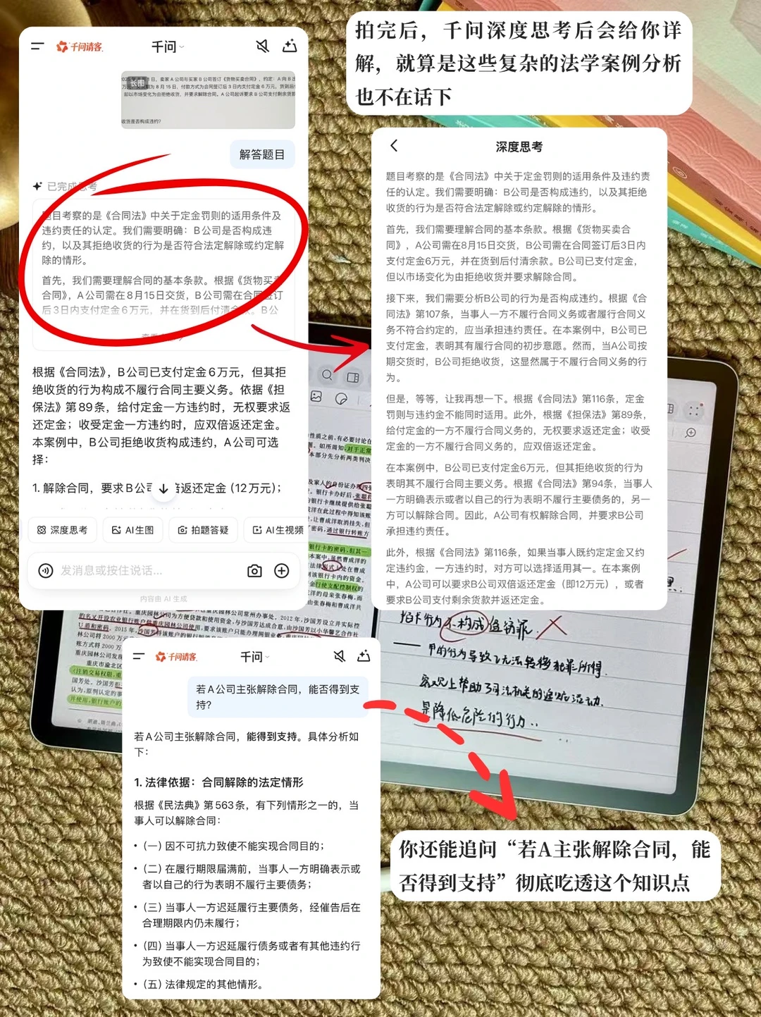 这时候千问也能帮上忙,比如我刷完一道“买卖合同违约纠纷”的题,但还是不明白,用千问的拍题答疑功能拍一下,就能看到详细的解题思路和步骤,比起看着答案自己琢磨要高效得多,学起来也不会那么浮躁。像是还不清楚“若A主张解除合同,能否得到支持”,也能直接追问,彻底吃透这个知识点