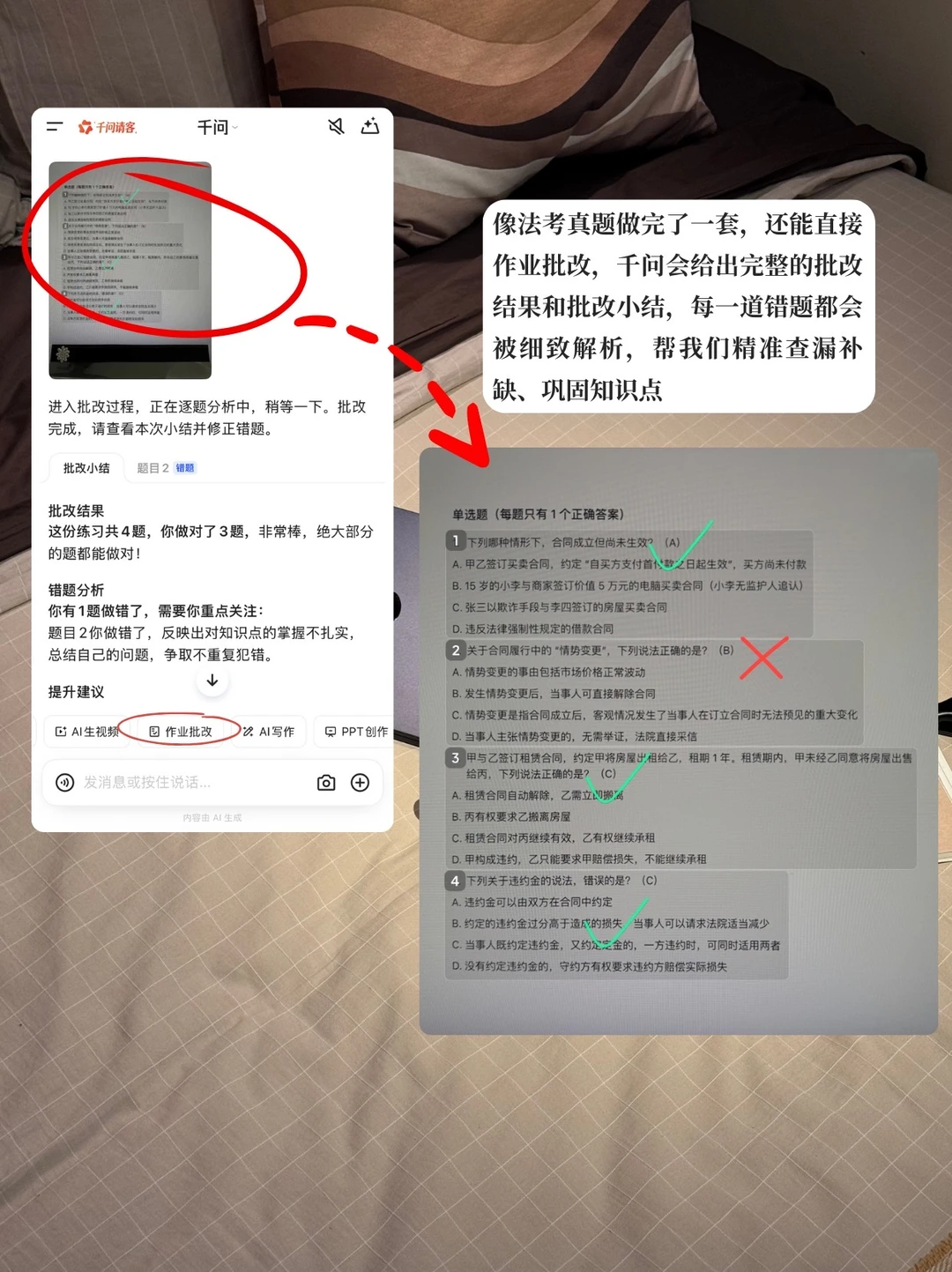 法考真题做完了一套,还能直接用作业批改功能。千问会给出完整的批改结果和批改小结,比起自己一道道题对答案更高效。而且每一道错题都会被细致解析,帮我们精准查漏补缺、巩固知识点