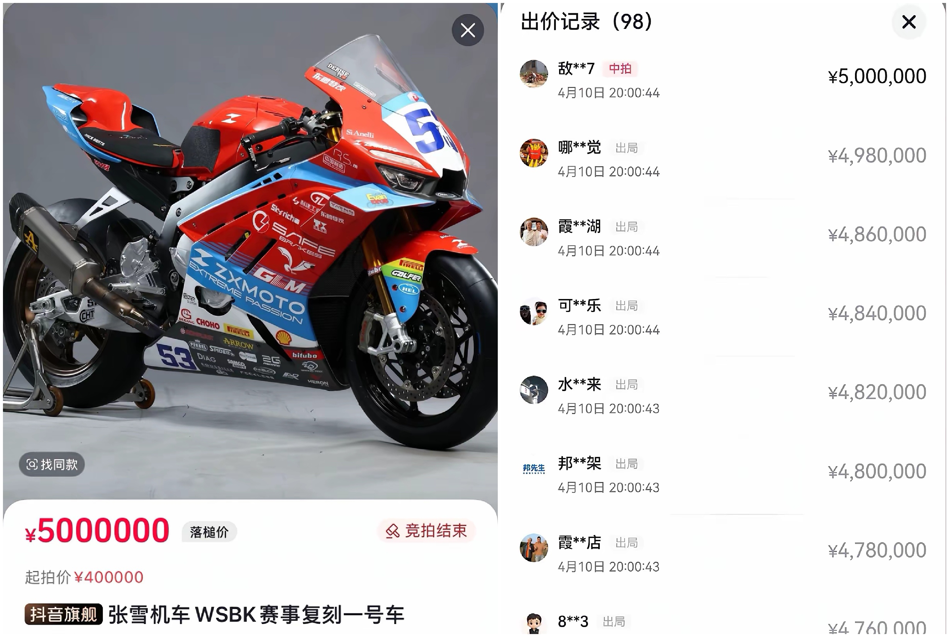 2026年4月10日,晚8点整。张雪机车官方直播间,WSBK夺冠赛车53号复刻版正式开拍。起拍价40万元,封顶500万元,每次加价2万元。