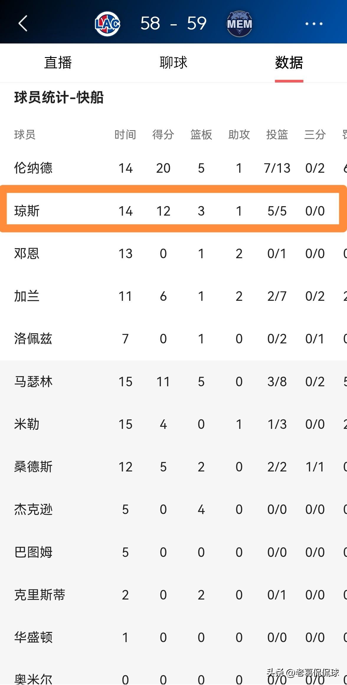 快船大将小琼斯真是太反常了!在今天快船客场挑战灰熊的比赛中,目前双方的上半场比赛已经结束,快船以58:59落后对手1分。让人感到非常惊喜的是,在前两节比赛中,向来不擅长投射的小琼斯却一反常态,他在首发出战的14分钟里,投篮5中5,其中罚球2中2极其高效的砍下12分,还有3篮板1助攻1抢断,他的场上正负值为球队最高的+12。