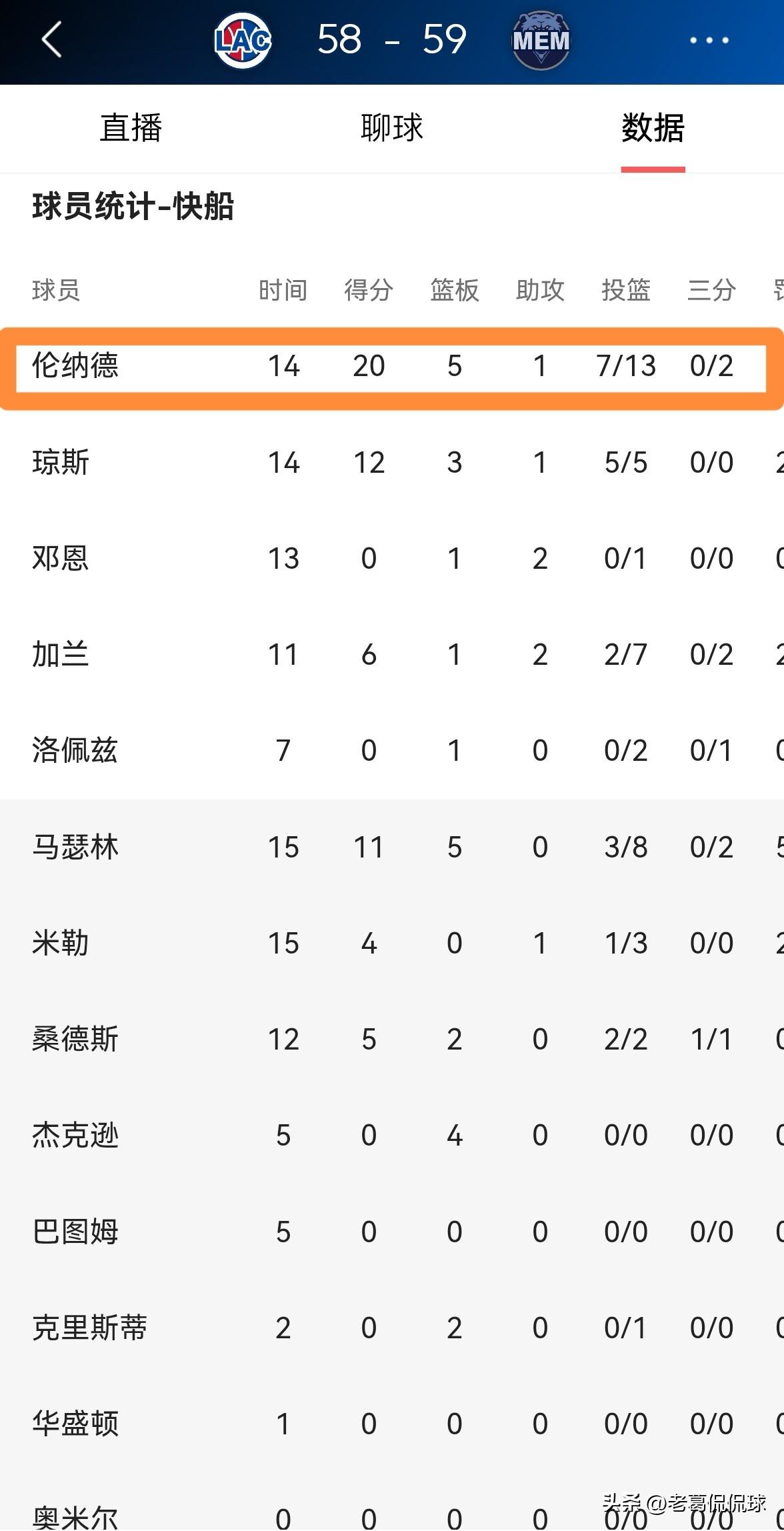 快船巨星伦纳德真是既当爹又当妈!在今天快船客场挑战灰熊的比赛中,目前双方半场战罢,快船以58:59落后于对手。值得一提的是,在前两节比赛中,伦纳德是既当爹又当妈,他在首发出战的14分钟里,投篮13中7,其中三分球2中0、罚球7中6爆砍20分,外加5篮板1抢断,没有出现任何的失误和犯规,他的场上正负值为+11。