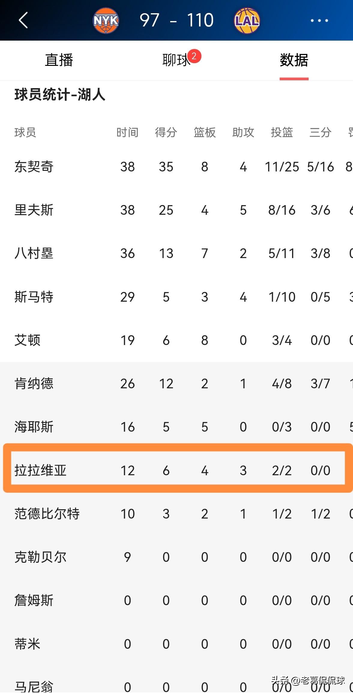 湖人大将拉拉维亚终于不拉胯了!在今天湖人主场以110:97力克尼克斯的比赛中,拉拉维亚在攻防两端都打出了可圈可点的表现,他在替补出战的12分钟里,投篮2中2,其中罚球2中2得到6分,外加4篮板3助攻,他的场上正负值为+8。
