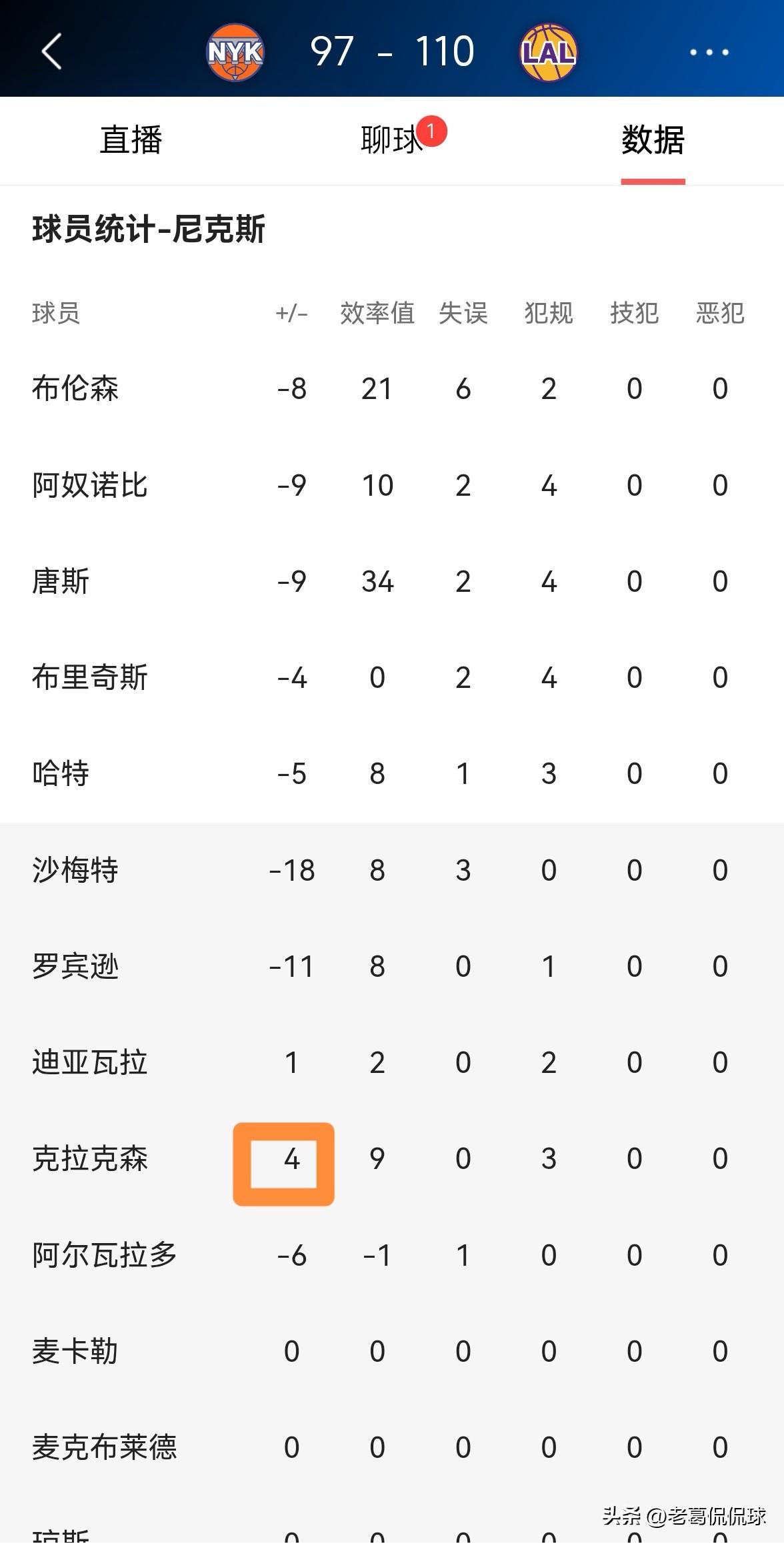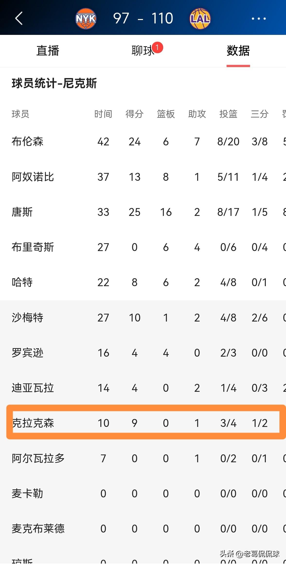 毫不夸张的说,如果本场比赛克拉克森能够多上场5分钟,我相信尼克斯绝对有机会赢下比赛,可惜的是尼克斯主帅布朗在上半场比赛中弃用了克拉克森。