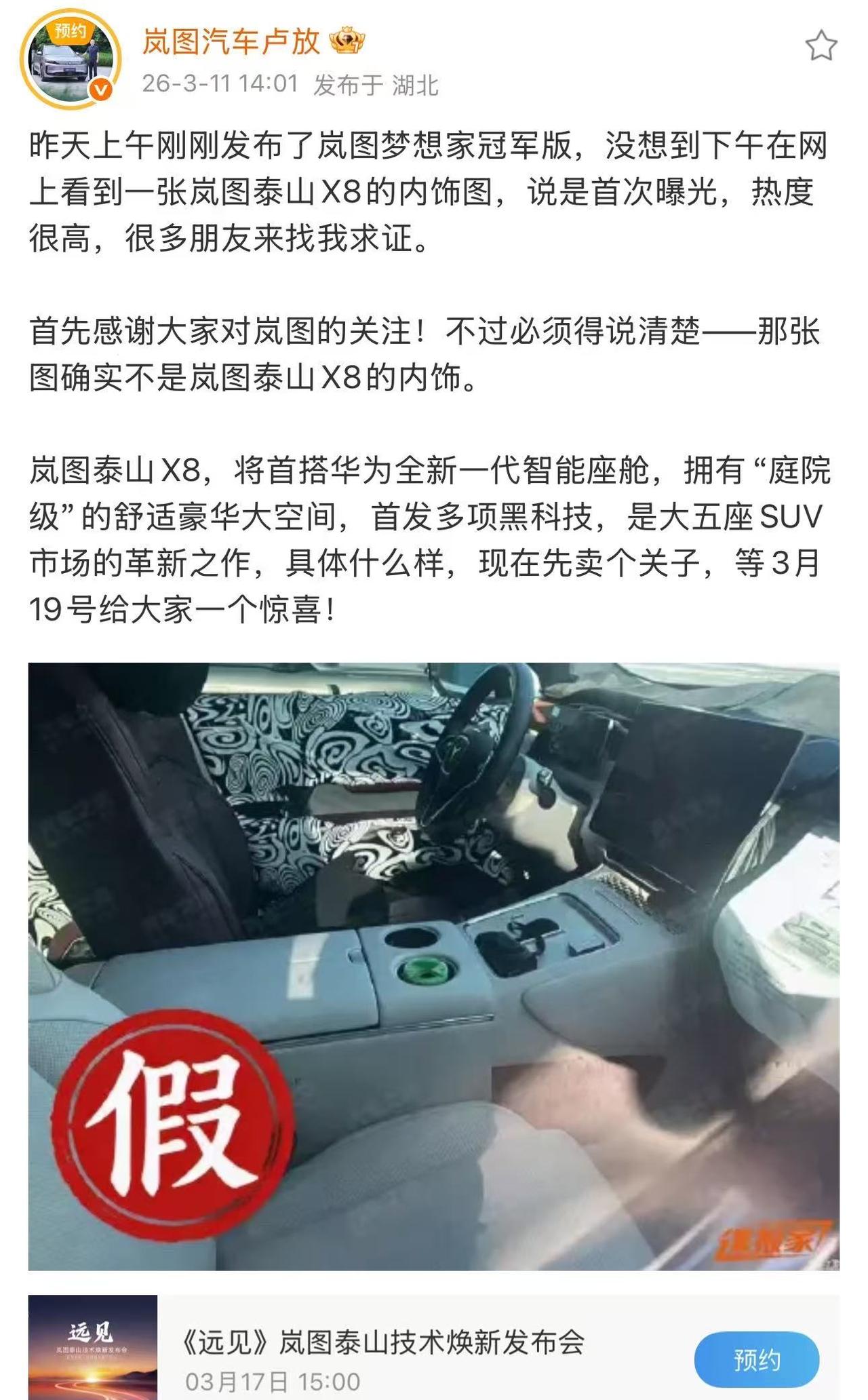 今日岚图卢总也辟谣,泰山X8内装并非这样