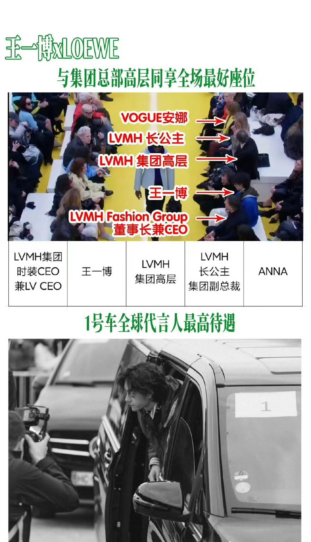 王一博罗意威秀后发文王一博是LVMH集团ins官网发过的唯一亚洲明星。一群LVMH集团的高层围绕着一个香奈儿的大使,无以复加的极致奢宠
