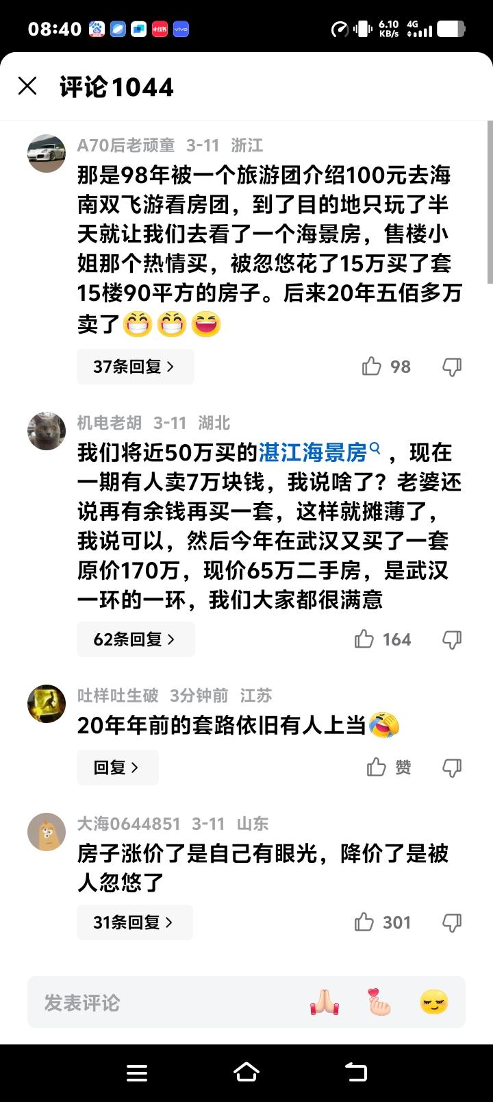 这并非个例。翻看评论区,无数相似故事浮出水面。从海南到广西北海,从山东乳山到龙口,“免费看房团”的套路二十年来如出一辙。大巴拉去,半天游玩,紧接着便是密集的售楼攻势与热情款待,许多中老年人在异地他乡的氛围裹挟下,掏出了毕生积蓄。