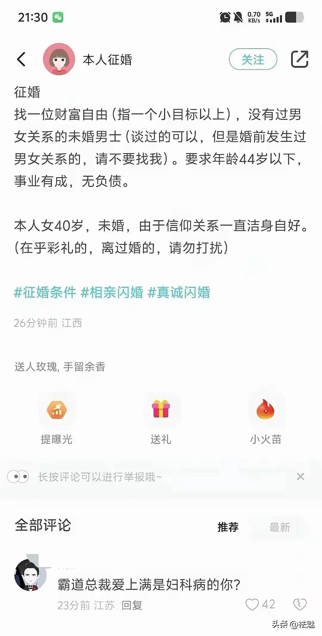 40岁江西女子征婚引爆全网:要男方亿万身家且守身如玉,是信仰坚守还是当代“许愿池”行为艺术?