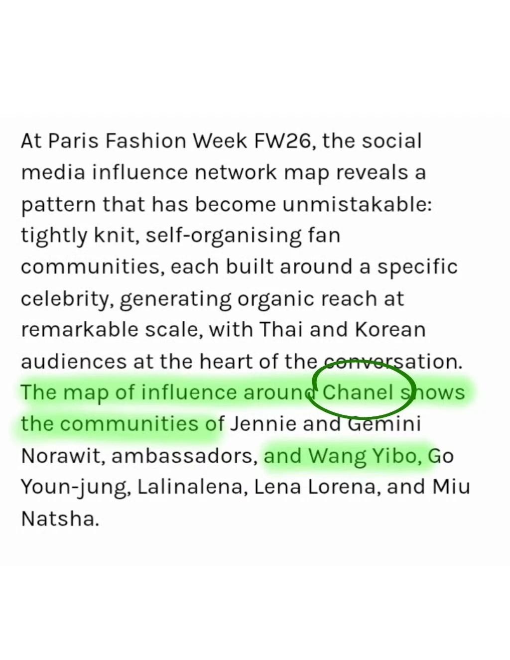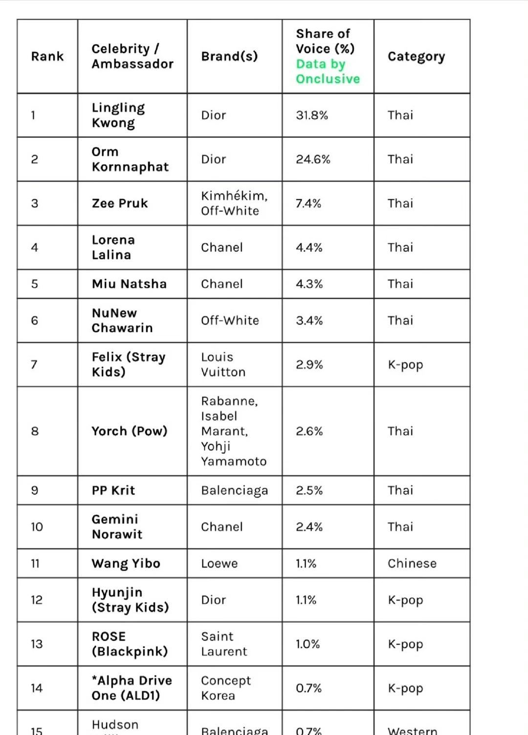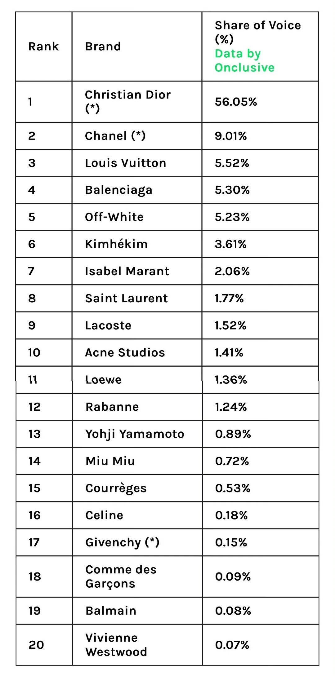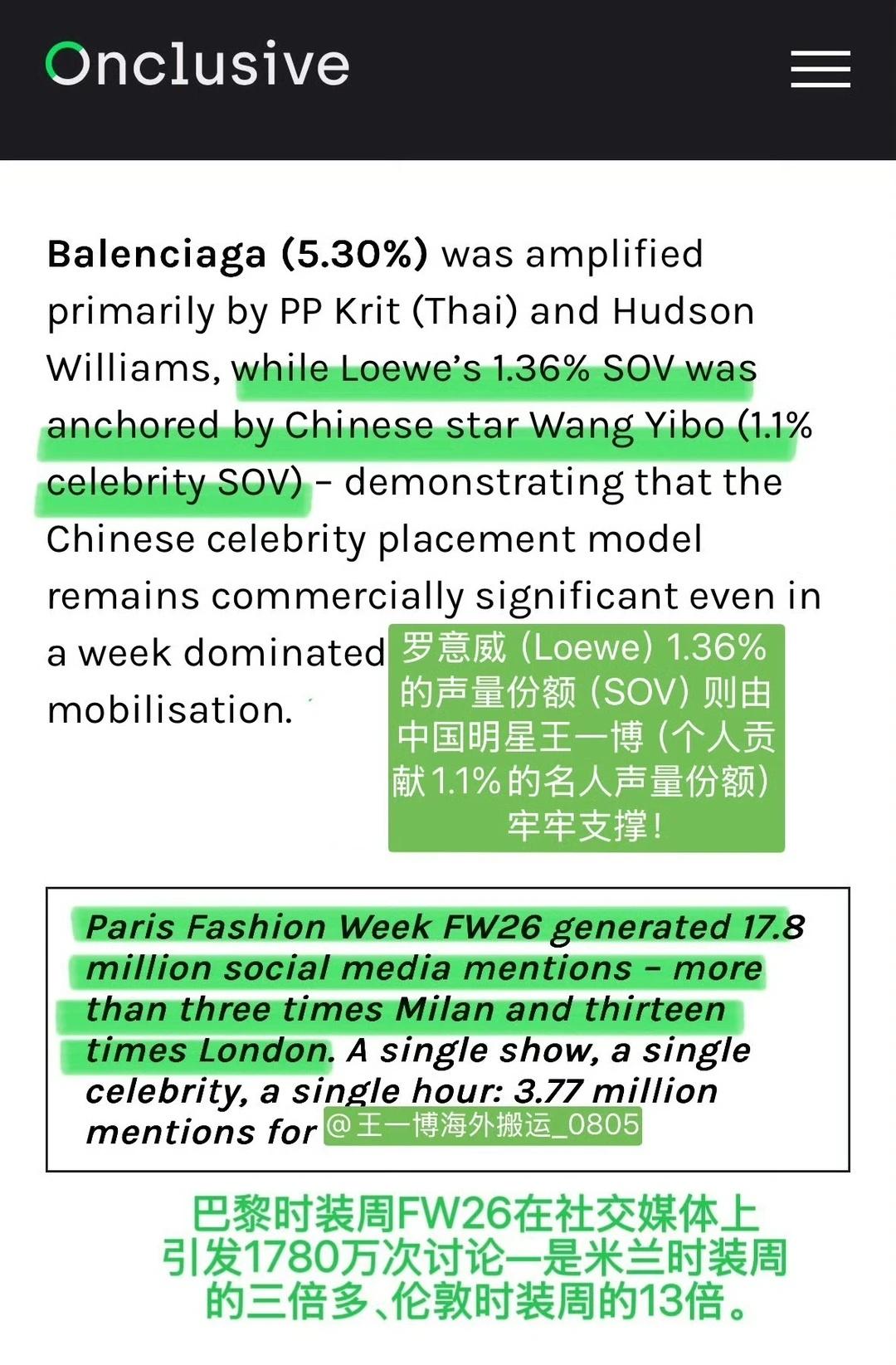 还有巴黎时装周的一组数据!Onclusive公布的全球声量数据(仅统计推特和IG,不包含微博),王一博是唯一上榜的中国艺人。罗意威1.36%的声量份额里,王一博一个人贡献了1.1%!!也就是说这个品牌在时装周期间的热度,几乎等于王一博本人在外网的热度啊喂!!