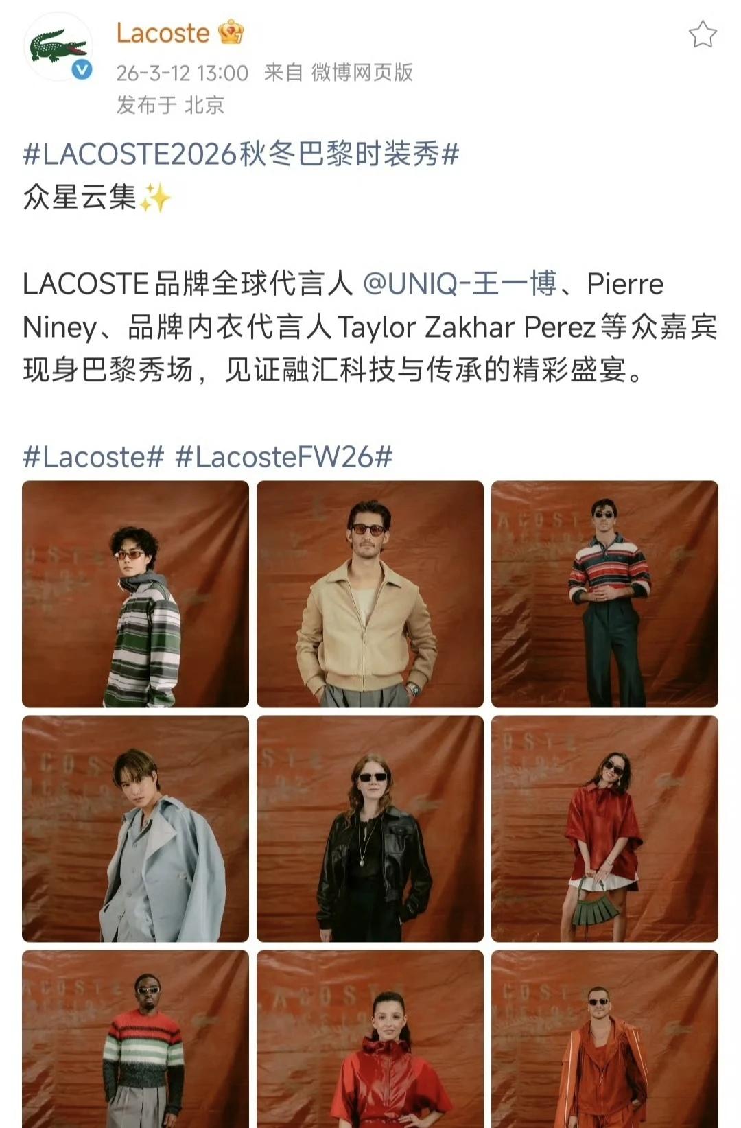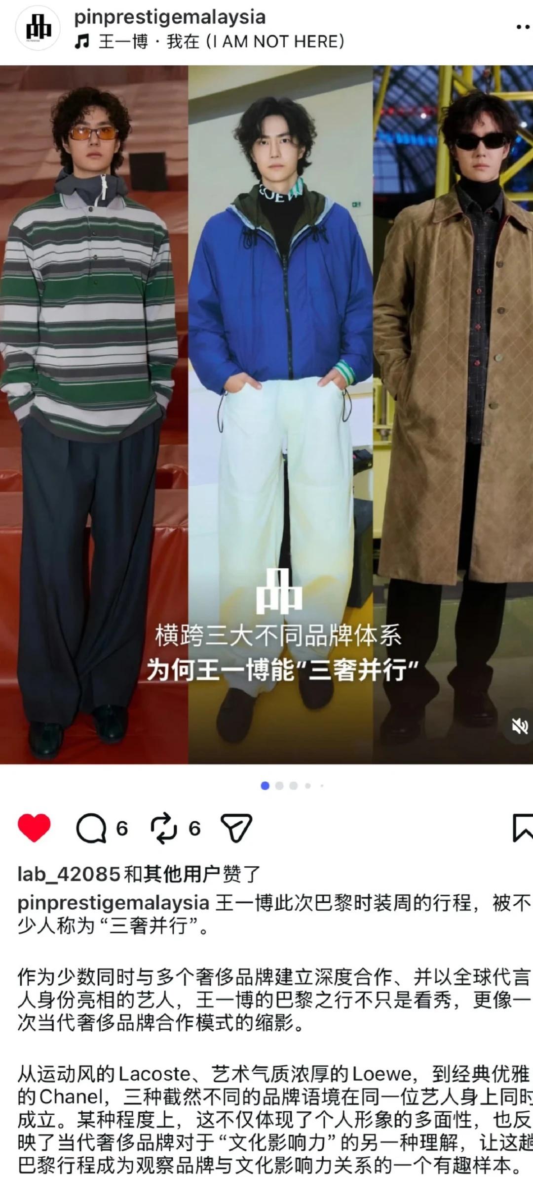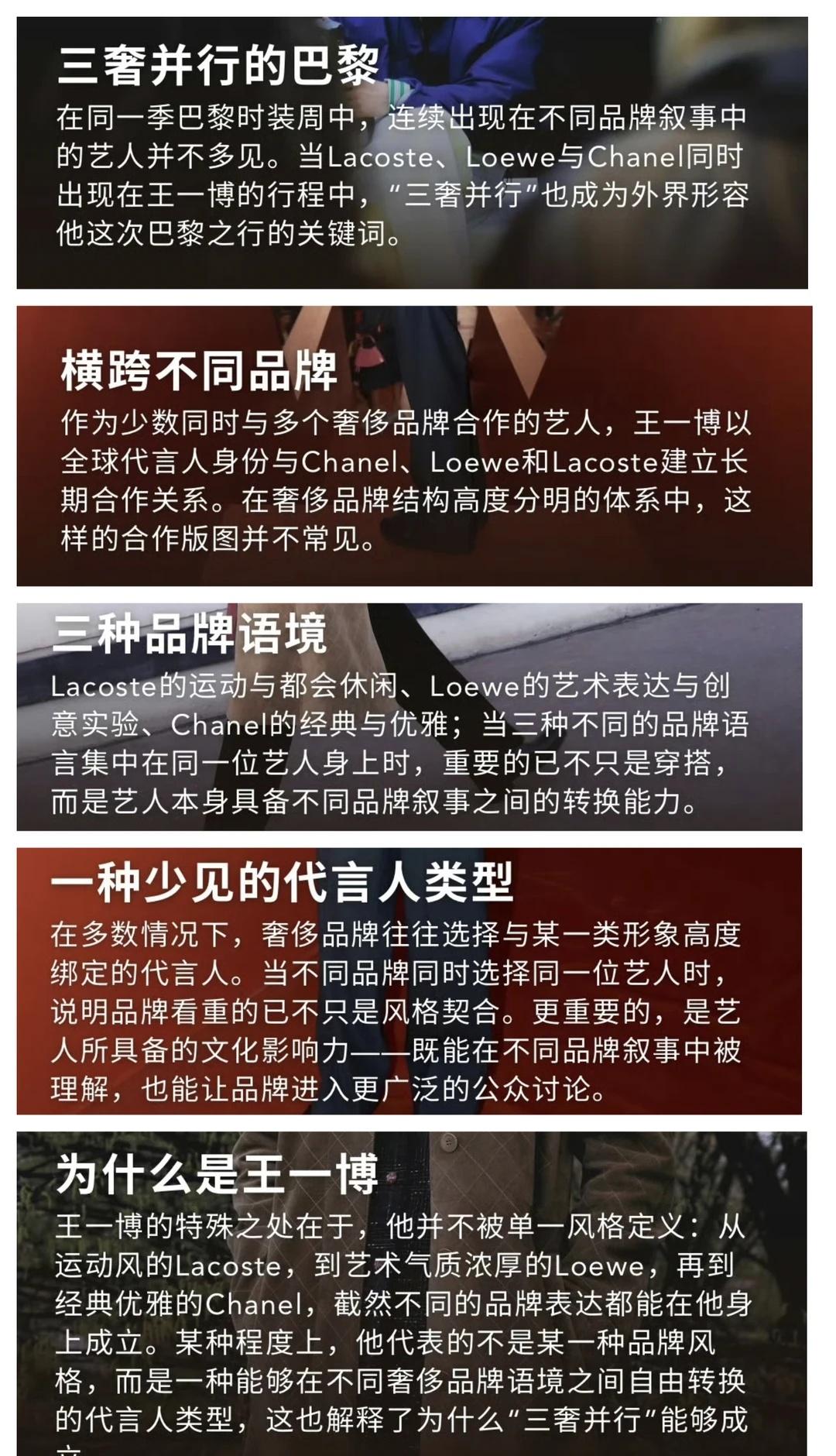 香奈儿,罗意威,Lacoste三大奢牌社交平台发文的第一顺位都是王一博,王一博可以拥有所有风格,也代表的绝对星光!