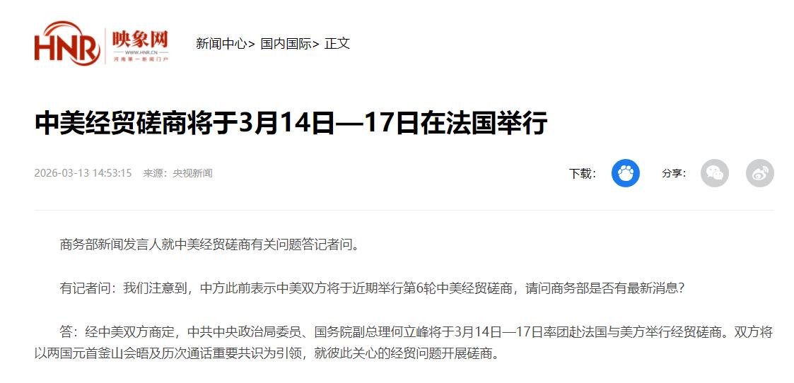 2026年3月13号,中国商务部发了个重要消息,中美双方商量好了,要在3月14号到17号,在法国举行第六轮经贸磋商。