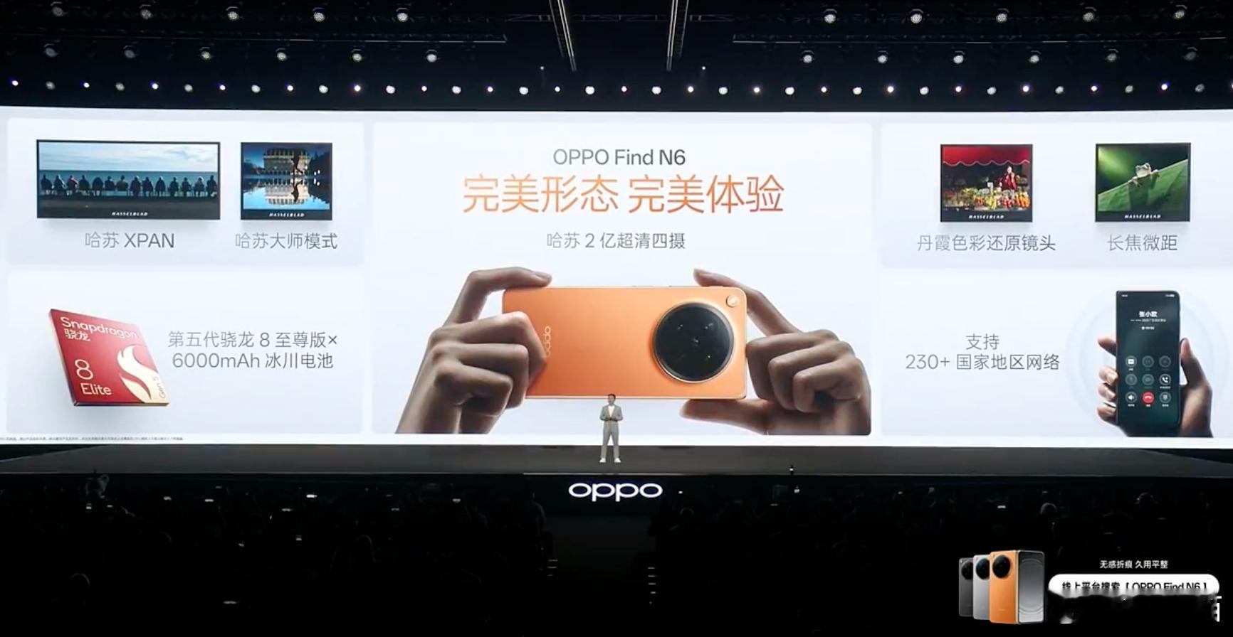 OPPO Find N6参数:骁龙8 Elite Gen 5处理器8.12英寸三星内屏;6.62英寸京东方外屏内外屏都支持1nit前置20MP+20MP200MP+50MP超广+50MP 潜望长焦+2MP丹霞镜头哈苏人像,长焦微距,哈苏大师等6000mAh电池,80W有线闪充+50W无线闪充IP56/IP58/IP59防水66个网络频段,230多个国家和地区网络首款通过德国莱茵 60 万次折叠测试折叠屏售价新一代钛合金天穹铰链+天穹记忆玻璃金橙、原钛、深黑三个颜色支持手写笔新机来了