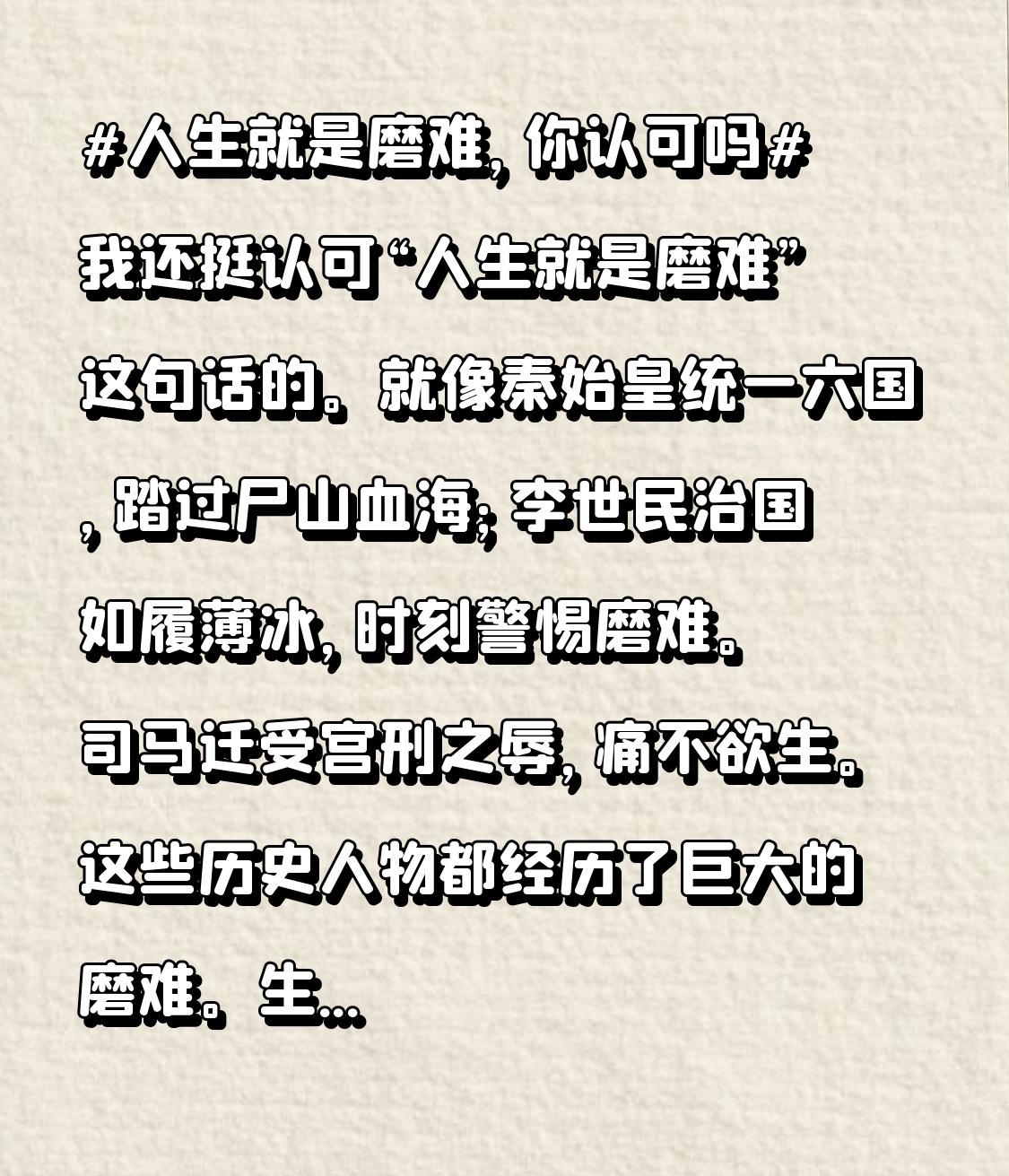 我还挺认可“人生就是磨难”这句话的。就像秦始皇统一六国,踏过尸山血海;李世民治国如履薄冰,时刻警惕磨难。司马迁受宫刑之辱,痛不欲生。这些历史人物都经历了巨大的磨难。