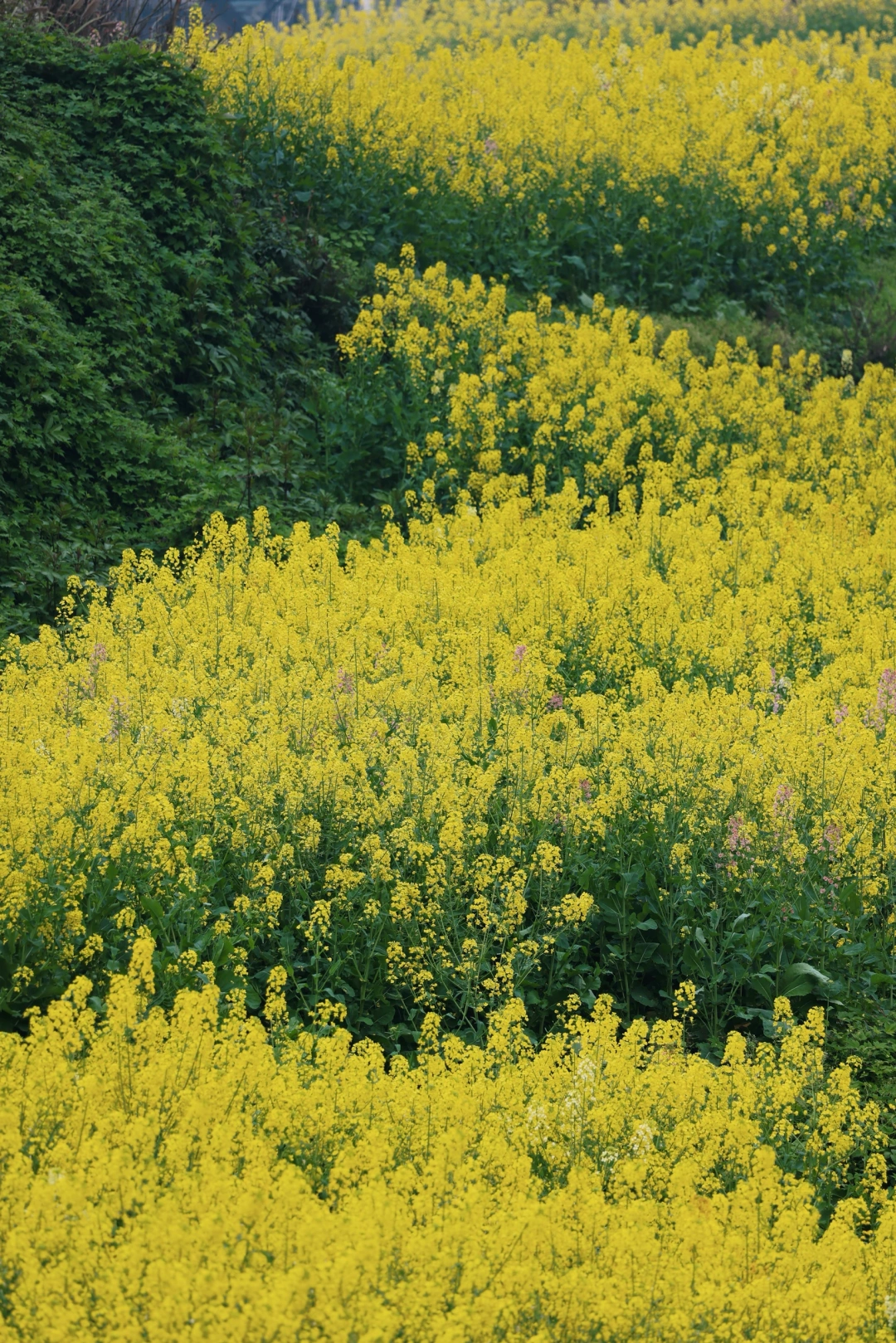 油菜花在微风中摇曳,形成层层波浪,美不胜收