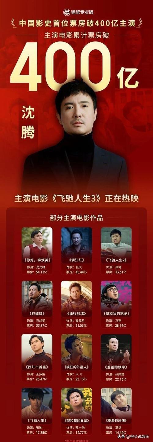 🔥看点!2月24日沈腾主演电影累计票房破400亿,成中国影史第一人!从《夏洛特烦恼》到《飞驰人生3》,他用25部作品缔造票房神话!“含腾量”为何成观影风向标?喜剧演员的天花板在哪?评论区聊聊你的看法!🎬沈腾400亿票房