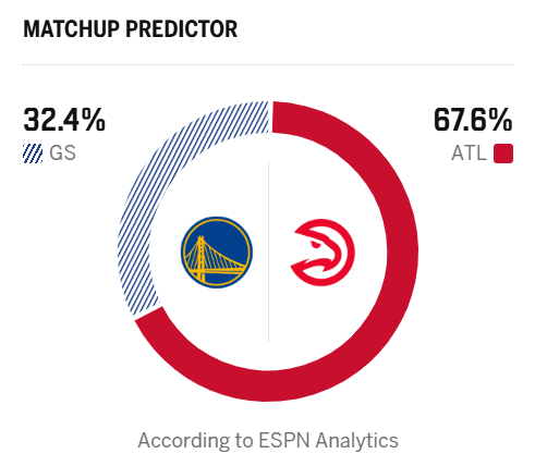 ESPN预测明日比赛:勇士胜率32.4%,老鹰胜率67.6%