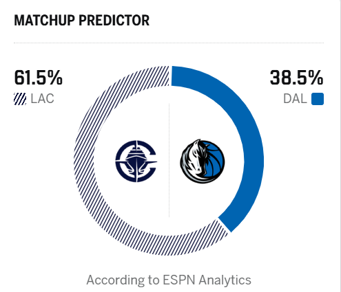 赛前,美媒ESPN预测本场比赛,独行侠胜率38.5%,快船胜率61.5%。
