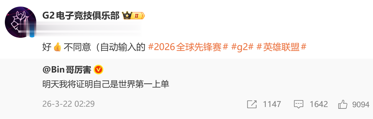 G2回应Bin“明天我将证明自己是世界第一上单”:好,不同意