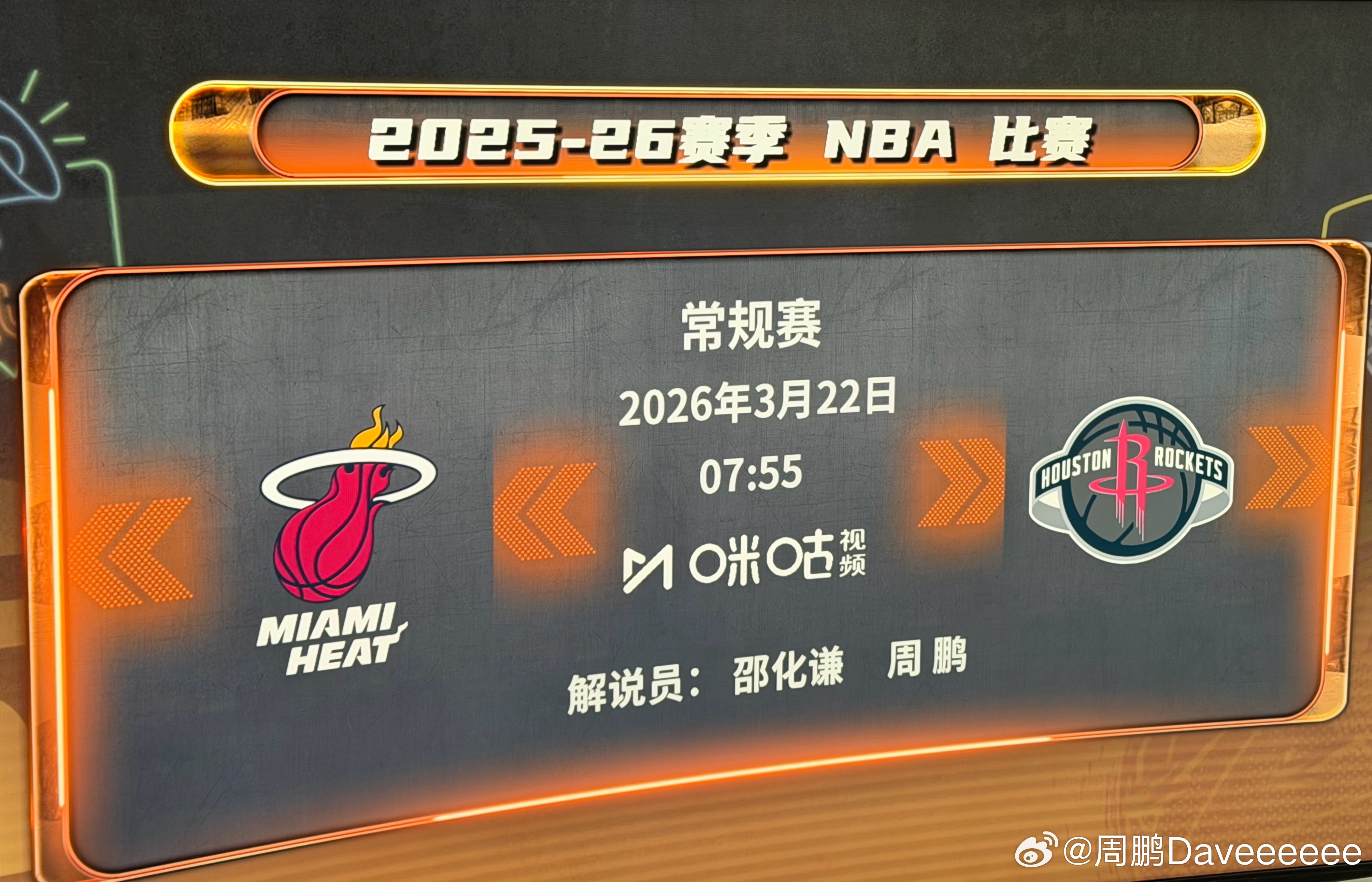 火箭先发:老杜申京阿门小谢我贾哥热火先发:阿德巴约希罗拉尔松米球冯泰奇奥这大煎饼