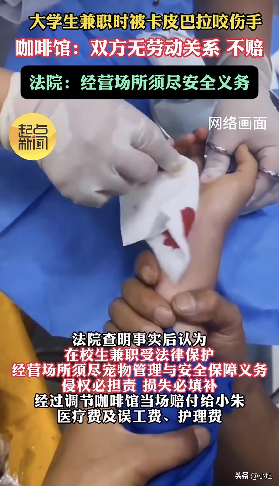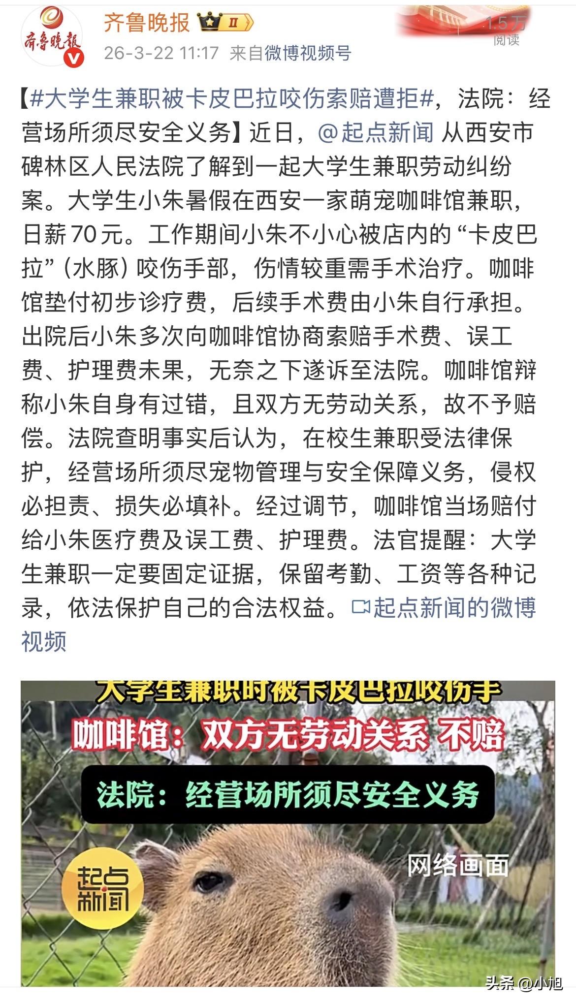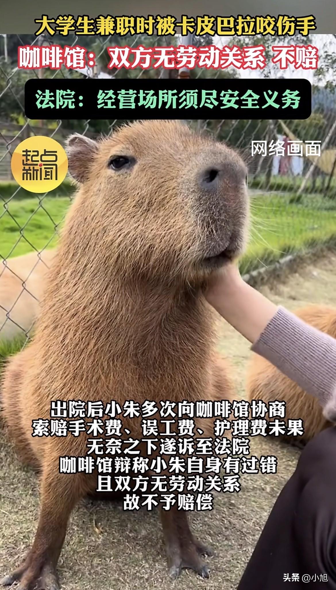 法庭上,咖啡馆的辩解听着挺唬人。第一,水豚是动物,它有脾气,你惹了它才咬你,你自己有过错。第二,你是学生,我们没签劳动合同,不算劳动关系,所以不赔。