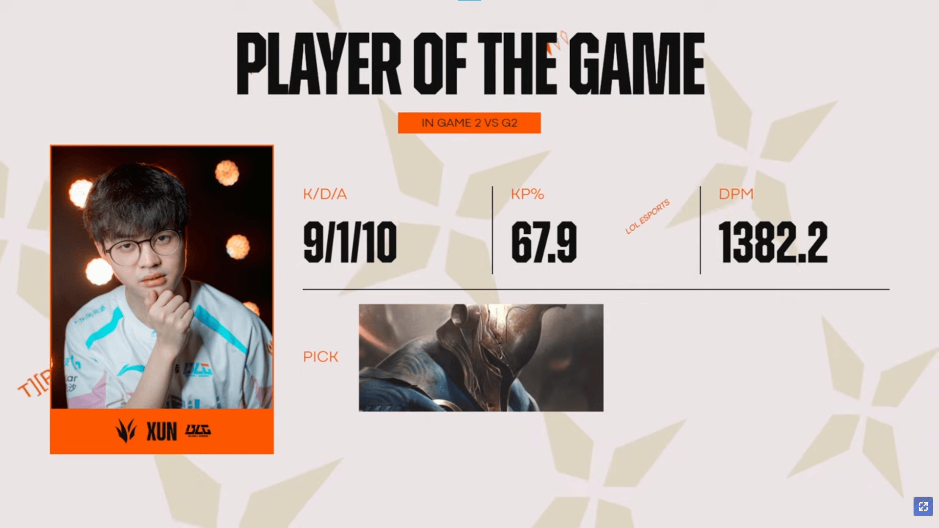 Xun潘森砍下9/1/10的战绩,拿下官方评选BLG对阵G2次局MVP