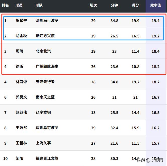 效率值第一,贺希宁在CBA常规赛国内球员MVP竞争中“遥遥领先”!——具体排名及预测如下: