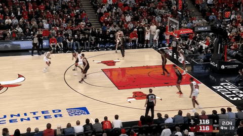 这是末节剩2分钟时的一个回合,公牛进攻,双方打成了116平,也算是火箭的关键防守回合,防下来就有机会反超比分,占得先机。
