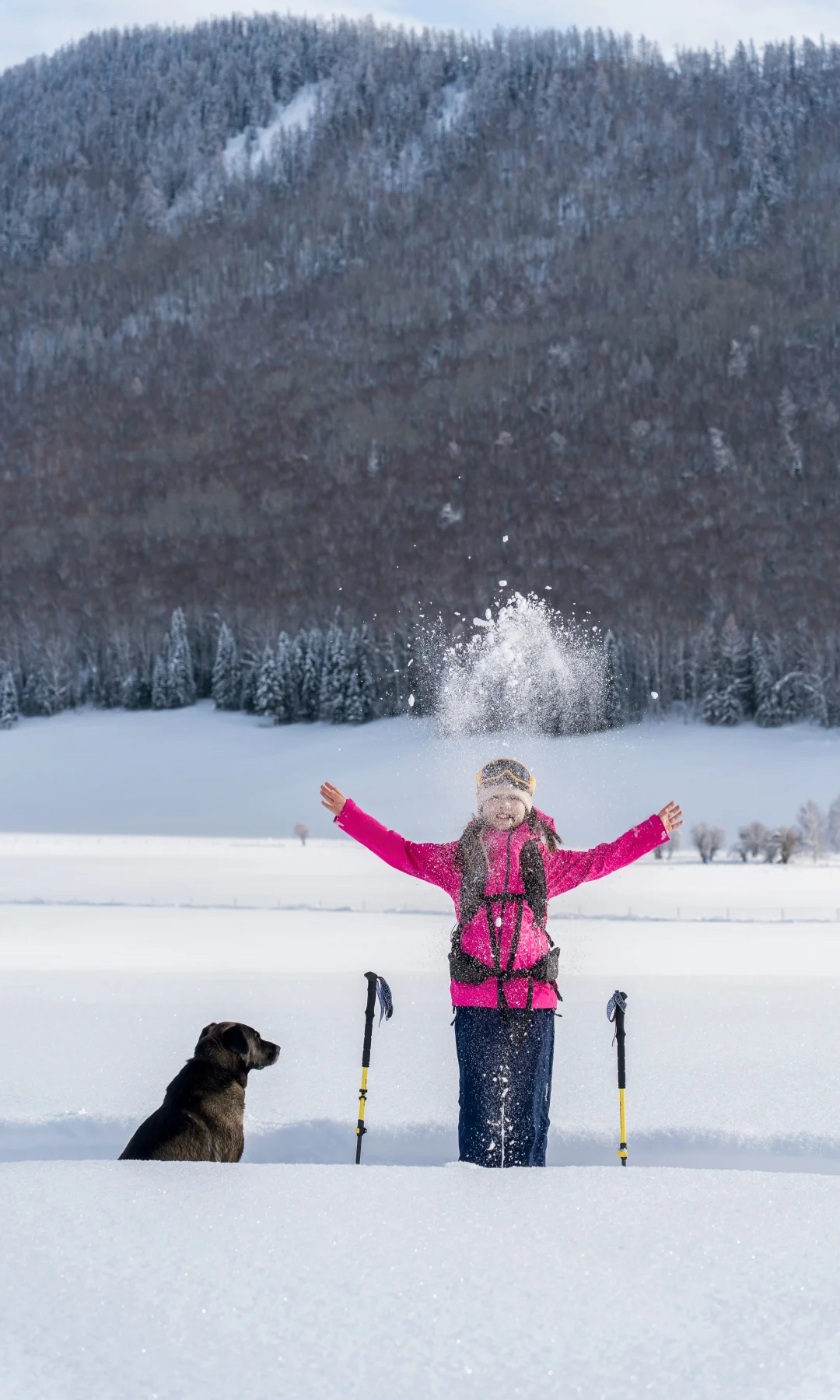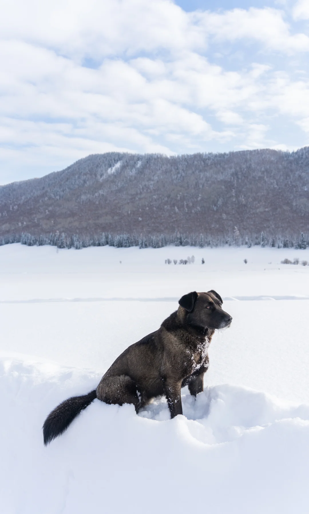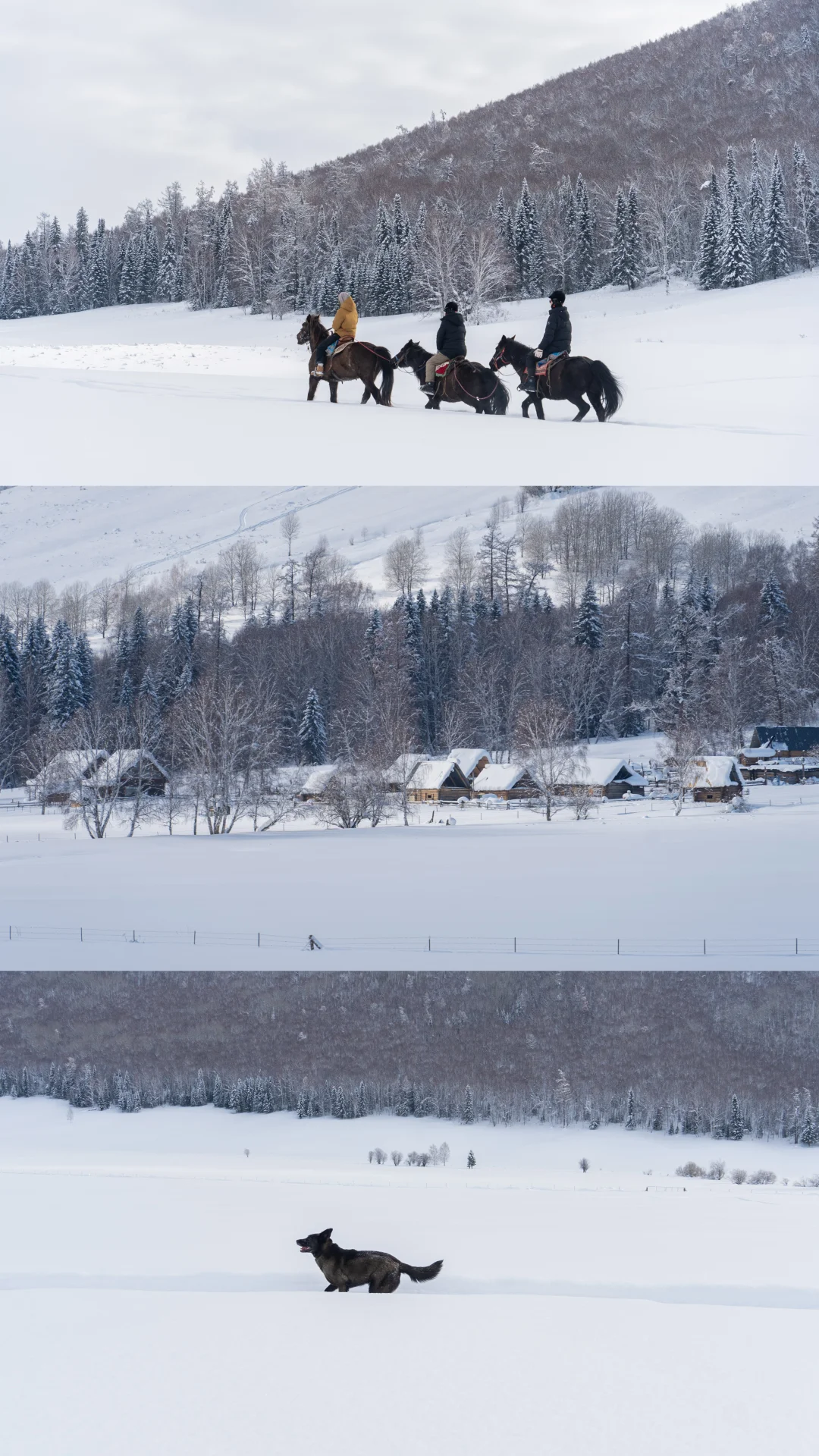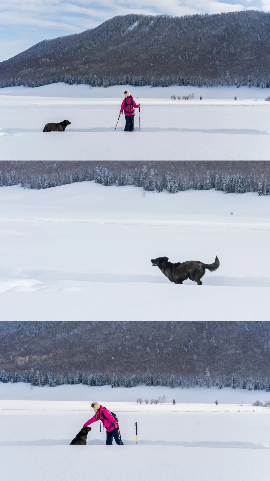 我们停下来拍照📸玩雪时,它也撒开欢儿,把脑袋埋进雪里拱来拱去,啃几口雪,或是像小兔子🐇一样蹦蹦跳跳在无痕的雪地上踩出小碎路,玩的超开心😆