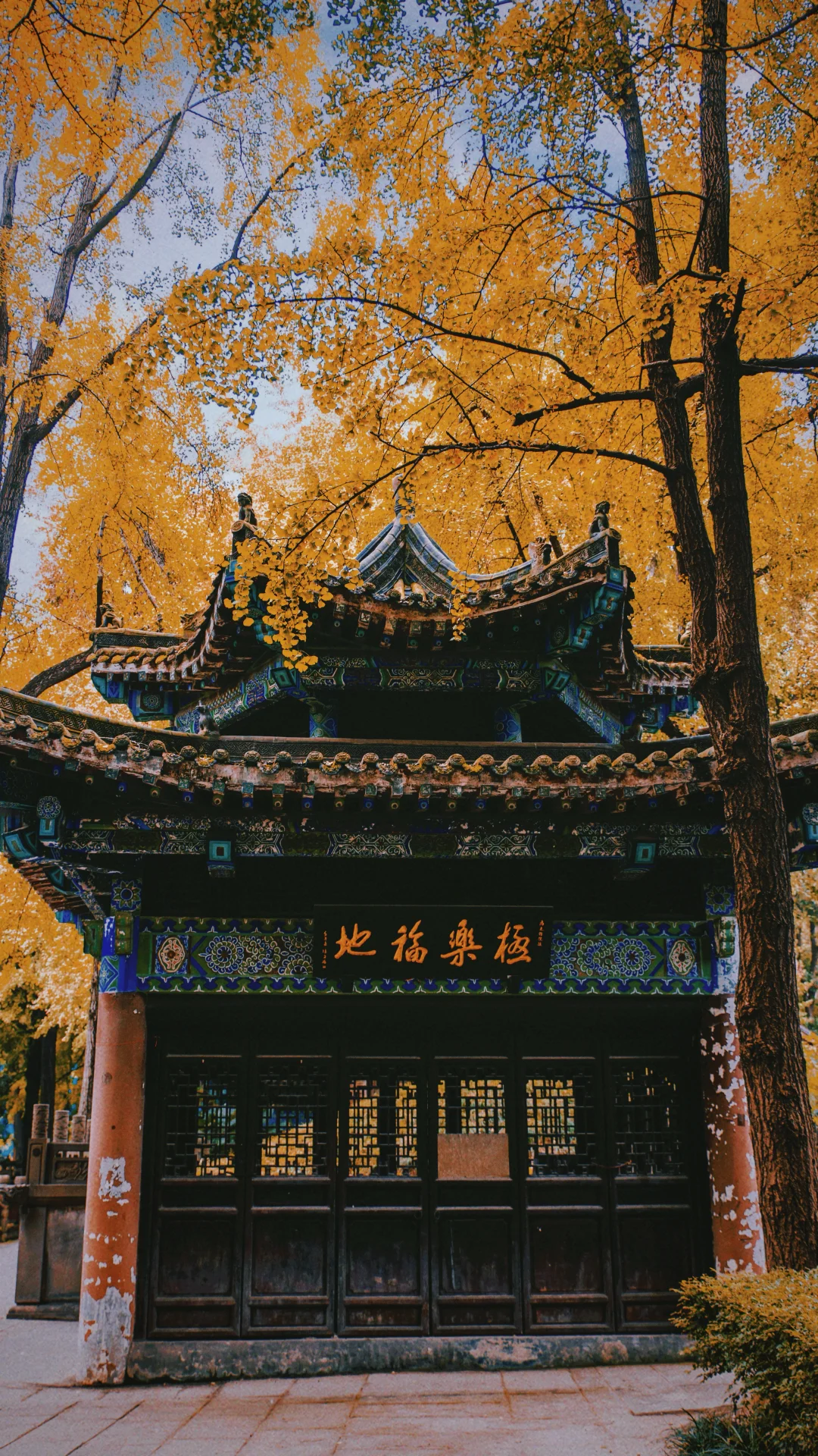 按着中轴线依次参观几座大殿,银杏就在鼓楼外面,还有一片银杏树林在文殊阁旁边。