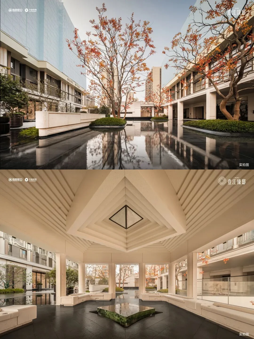 往里走,超大的镜面水院、风雨连廊、浮岛廊亭一步一景,回家的路都像在逛一座精致的艺术园林。