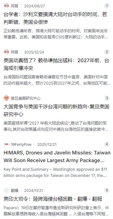 赖岳谦还发现了一个特别危险的信号——美国军方自己在卡时间。美国海军作战部长公开说过,要在2027年把80%的舰艇调整到战备状态。这话说白了就是给自己定了个“能打仗”的时间表。为什么选2027年?因为美国智库和军方内部之前就有个“戴维森窗口”的说法,预测大陆可能在2027年前解决台湾问题,所以他们就把这个年份当成了自己干预台海的最后机会 。