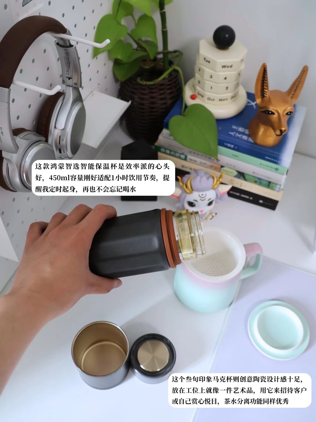 每小时给自己5分钟的松弛时间,拉伸、看远、喝茶,短暂的抽离是为了更好地投入;我桌上的这个智能保温杯+马克杯,就是我“带薪养生”的最佳拍档,它让喝水这件小事,变得有仪式感,也更高效: