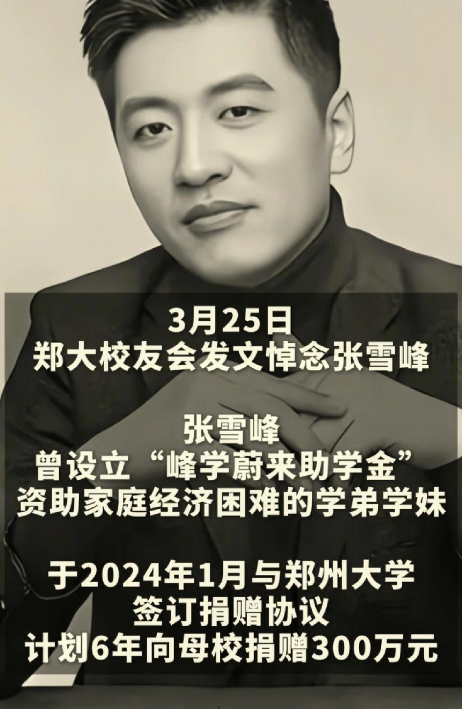 张雪峰大学毕业照。郑州大学环境与水利学院,2003级,给水排水工程专业。第三排,最右边穿格子衣服,瘦瘦高高,黑黑的就是他。看起来腼腆内敛青涩,和现在的这面貌比差距很大。他是郑州大学最出名的校友,每年捐助50万给母校的贫困学生,计划捐6年。郑州大学今天也发文悼念最亲爱的校友张雪峰先生。张雪峰生前也多次回到母校看望老师。如今斯人已逝,令人唏嘘,只留下影像,使人怀念。