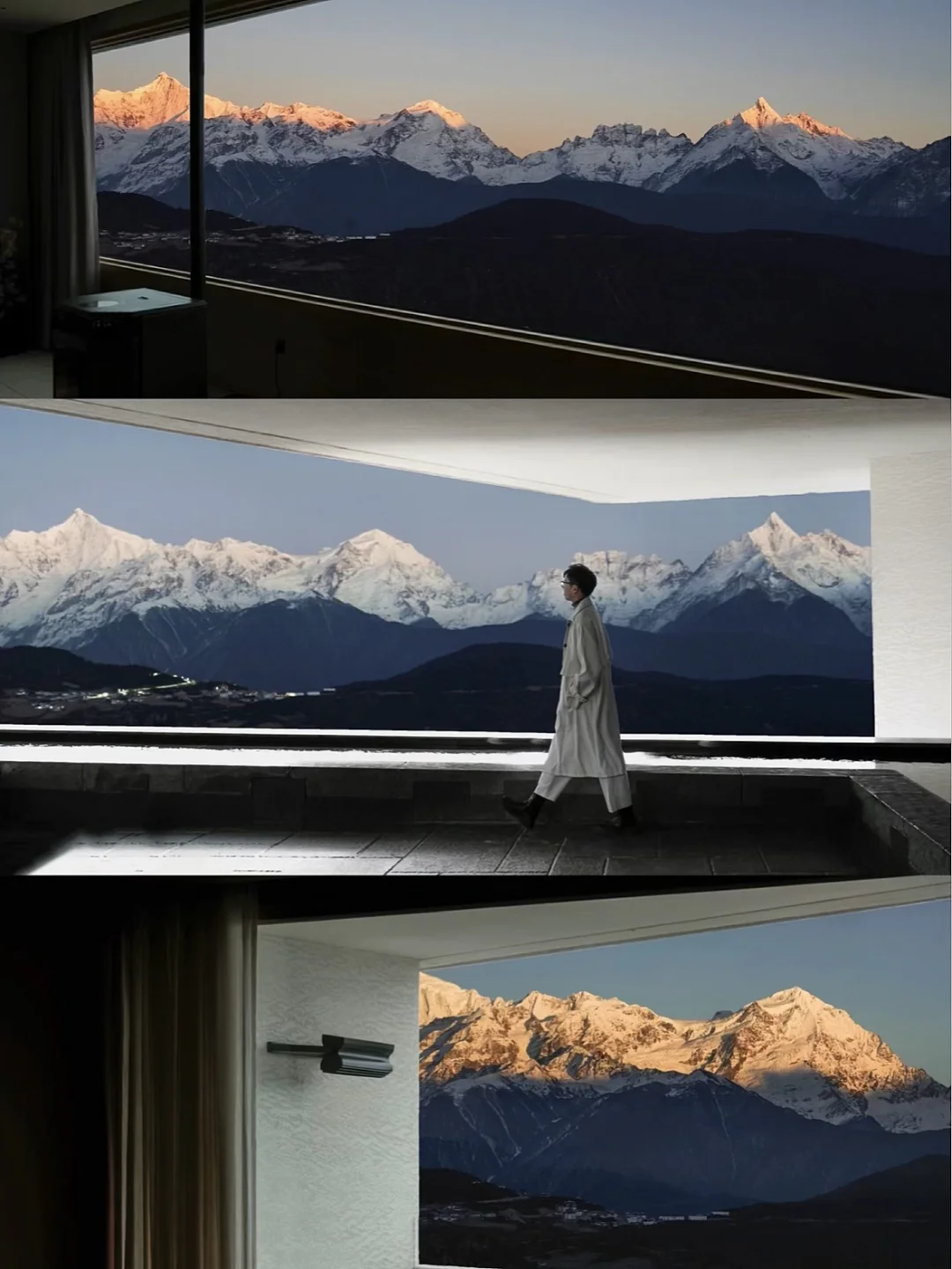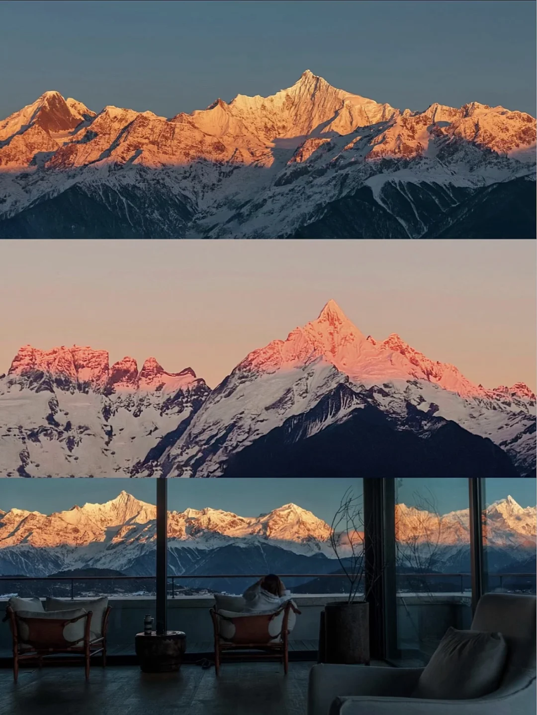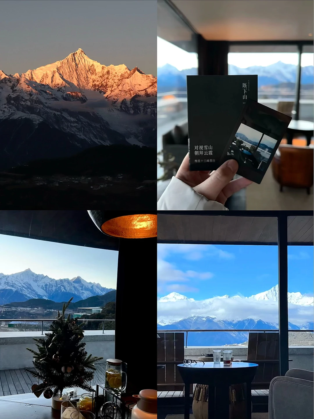 明星网红抢着来住的的全景雪山酒店,侘寂风非常出片📸,360°超.大落地窗正对雪山,看梅里十三峰在眼前一字排开十分震撼,4楼公区视野绝,但只有高价套房能躺看金山