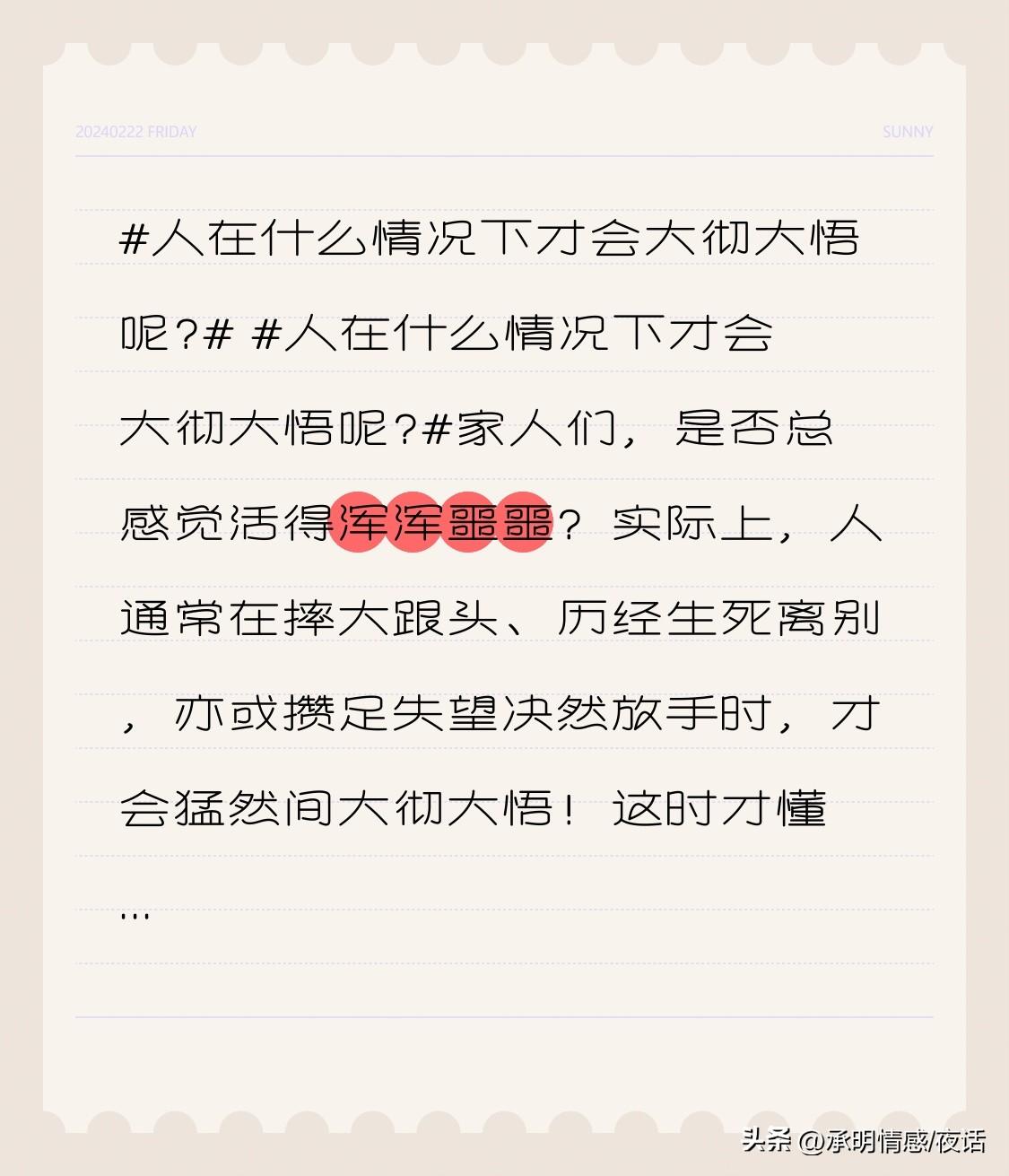 人在什么情况下才会大彻大悟呢? 人在什么情况下才会大彻大悟呢?家人们,是否总感觉活得浑浑噩噩?实际上,人通常在摔大跟头、历经生死离别,亦或攒足失望决然放手时,才会猛然间大彻大悟!这时才懂得,什么是重要的,什么是虚幻的。你们是哪个瞬间突然“开窍”的?点赞收藏,评论区聊聊!