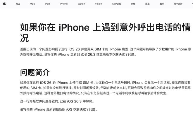 [环球网科技综合报道]3月26日消息,苹果官网于近日发文回应“部分用户遇到意外呼出电话的情况”。苹果公司已确认该故障源于运行早期版本iOS26系统的双SIM卡机型,并正式发布软件更新予以修复。官方建议所有受影响用户尽快将设备升级至iOS26.3或更高版本,以消除安全隐患。