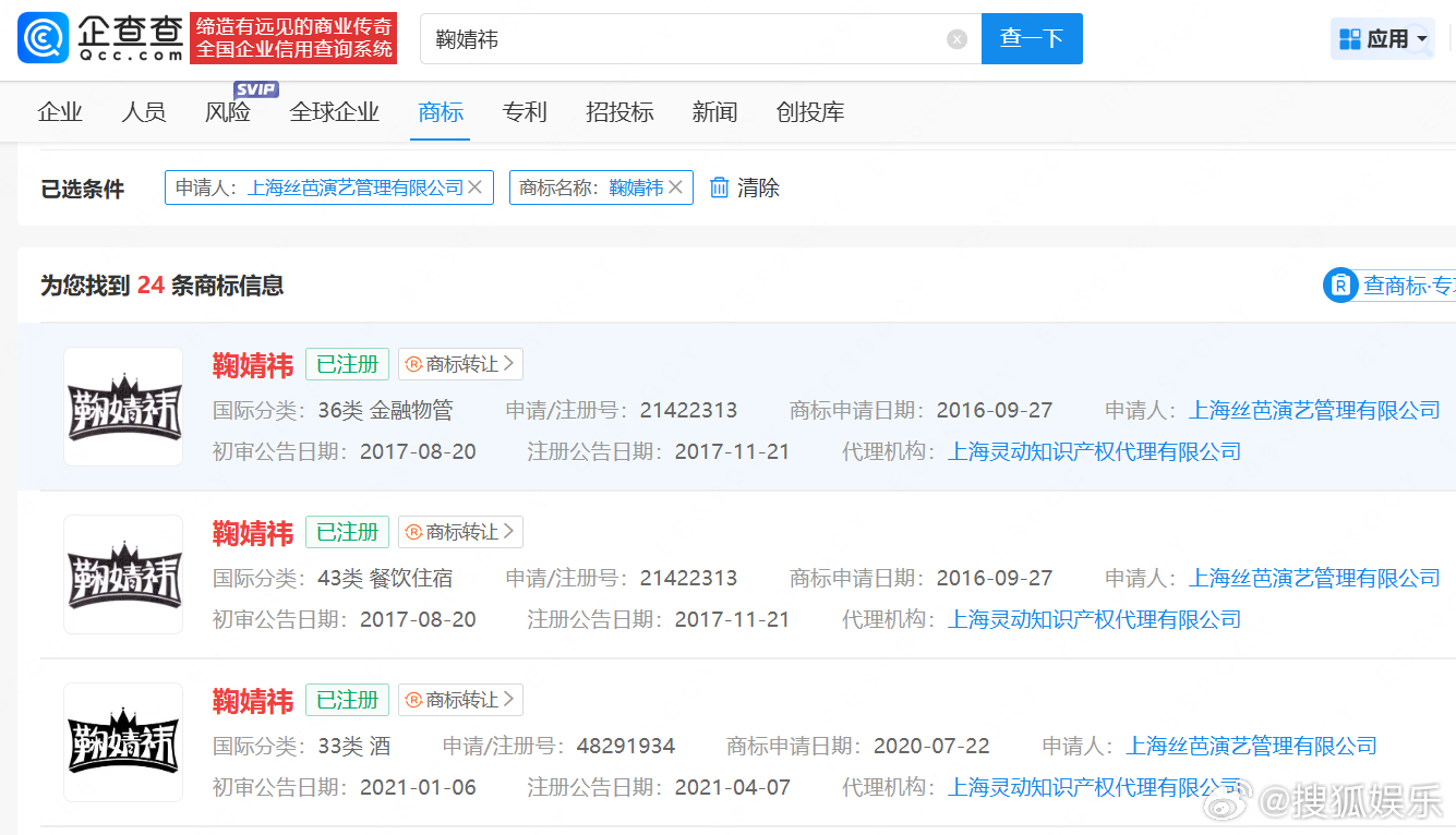 企查查APP显示,上海丝芭演艺管理有限公司目前仍持有24枚“鞠婧祎”姓名商标,涉及教育娱乐、广告销售等多个分类。此前据媒体报道,2025年12月鞠婧祎工作室发布声明,称其与丝芭传媒的经纪合约已于2024年6月终止,同时指控丝芭传媒伪造艺人签名及授权。对此,丝芭传媒晒出笔迹鉴定报告,否认伪造艺人签名及授权。丝芭仍持有鞠婧祎姓名商标 丝芭否认与鞠婧祎和解