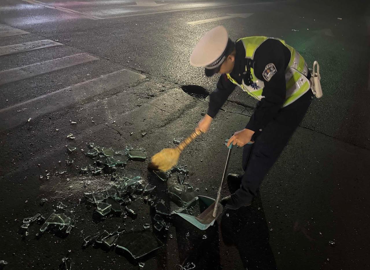 【荧光绿变身“清障侠”!】3月24日22时许,登封交警在颍河路与阳城路口夜间巡逻时,发现路面散落大量碎玻璃,对过往车辆和行人构成严重安全隐患。随即向附近商户借来清扫工具,分工协作、细致清理,迅速将路面碎玻璃全部清除干净,及时消除了隐患,保障了辖区道路安全畅通。深夜的一抹“荧光绿”,守护的是每一程平安路。