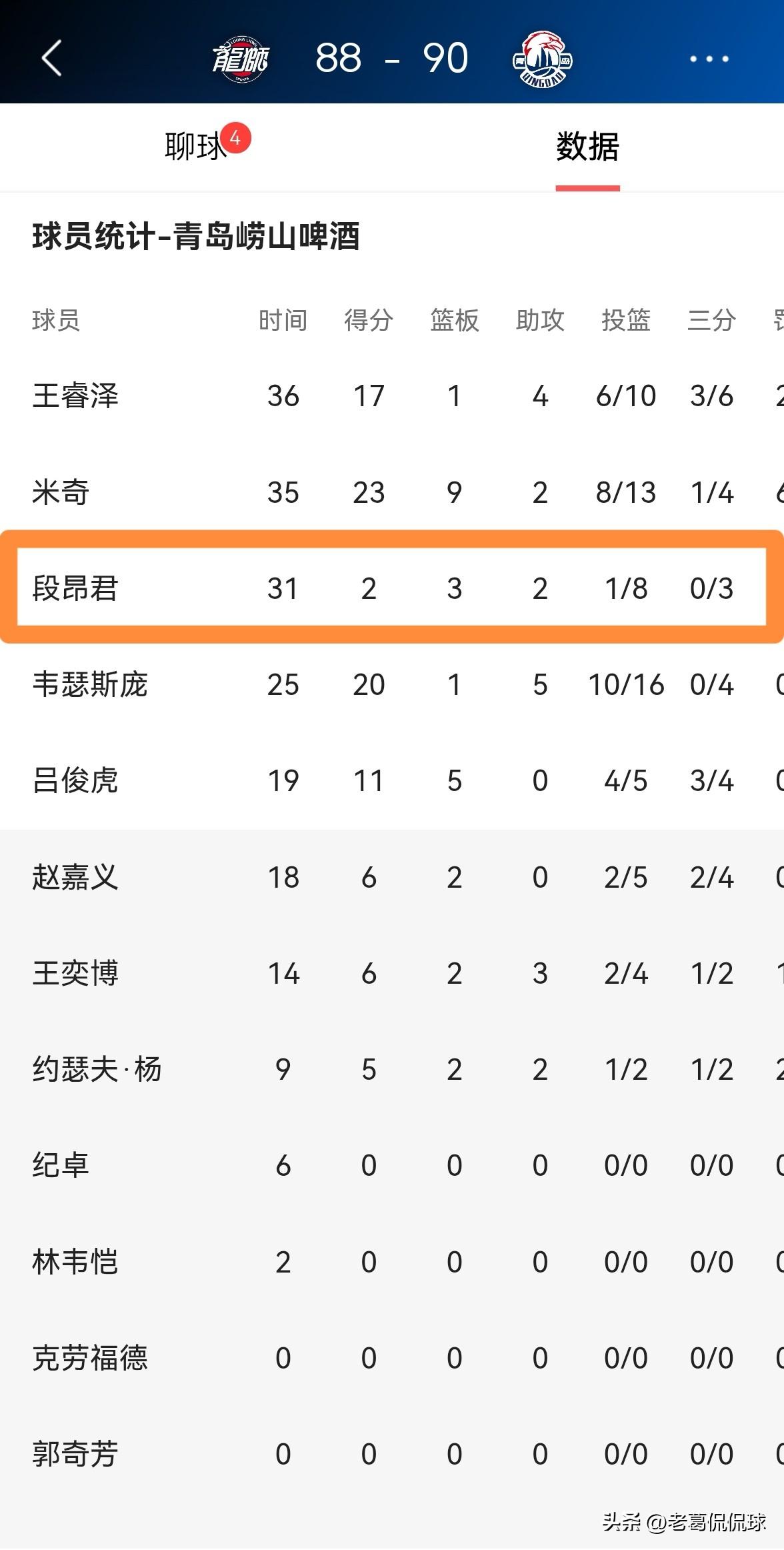 整场比赛下来,段昂君首发出战31分钟,投篮8中1,其中三分球3中0非常低效的得到2分。