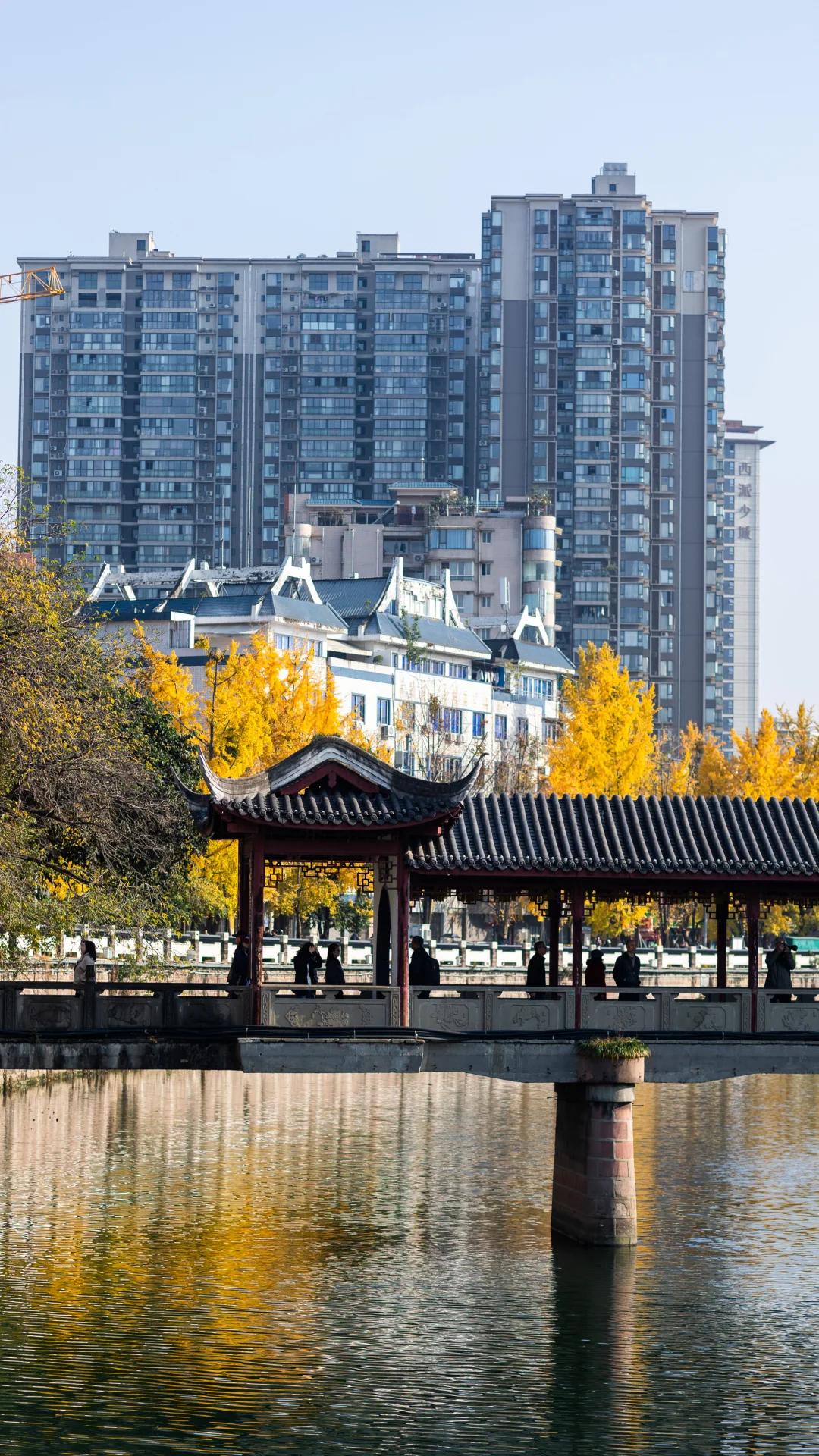 5️⃣从青羊宫出来往河边走,就到散花楼啦,就在百花潭公园入口旁边~ 登楼远眺,锦江两岸的银杏映着河水,金黄叶子飘在水面上,三楼的窗户框住满屏金黄,真的美到说不出话!傍晚还有落日余晖洒在楼檐上,氛围感直接拉满~