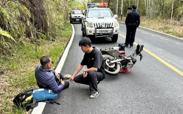 次日,胡雄斌外出途中再次偶遇越野车与摩托车相撞。摩托车驾驶员倒地受伤,而涉事的外地驾驶员夫妇也因方言不通,慌乱无措。见此情景,胡雄斌当即亮明身份,安抚当事人情绪,接过报警电话后精准报送事故点位与现场情况。等待救援期间,他主动疏导车流、全程看护伤者。